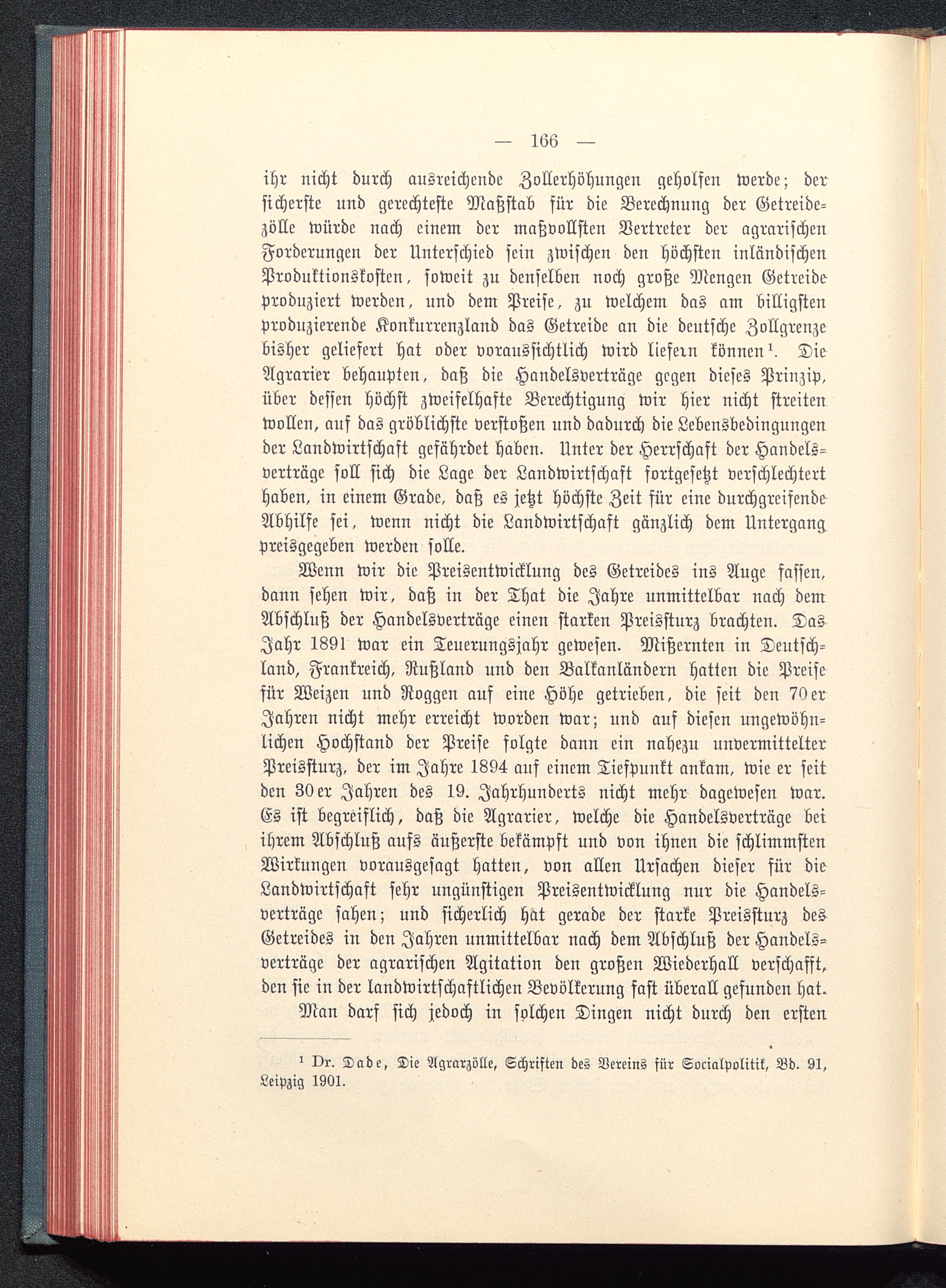 Wenn wir die Preisentwicklung des Getreides ins Auge fassen,dann sehen wir, daß in der That die Jahre unmittelbar nach demAbschluß der Handelsverträge einen starken Preissturz brachten. DasJahr 1891 war ein Teuerungsjahr gewesen. Mißernten in Deutsch-land, Frankreich, Rußland und den Balkanländern hatten die Preisefür Weizen und Roggen auf eine Höhe getrieben, die seit den 70 erJahren nicht mehr erreicht worden war; und aus diesen ungewöhn-lichen Hochstand der Preise folgte dann ein nahezu unvermittelterPreissturz, der im Jahre 1894 auf einem Tiefpunkt ankam, wie er seitden 30 er Jahren des 19. Jahrhunderts nicht mehr dagewesen war.Es ist begreiflich, daß die Agrarier, welche die Handelsverträge beiihrem Abschluß aufs äußerste bekämpft und von ihnen die schlimmstenWirkungen vorausgesagt hatten, von allen Ursachen dieser für dieLandwirtschaft sehr ungünstigen Preisentwicklung nur die Handels-verträge sahen; und sicherlich hat gerade der starke Preissturz desGetreides in den Jahren unmittelbar nach dem Abschluß der Handels-verträge der agrarischen Agitation den großen Wiederhall verschafft,den sie in der landwirtschaftlichen Bevölkerung fast überall gefunden hat.