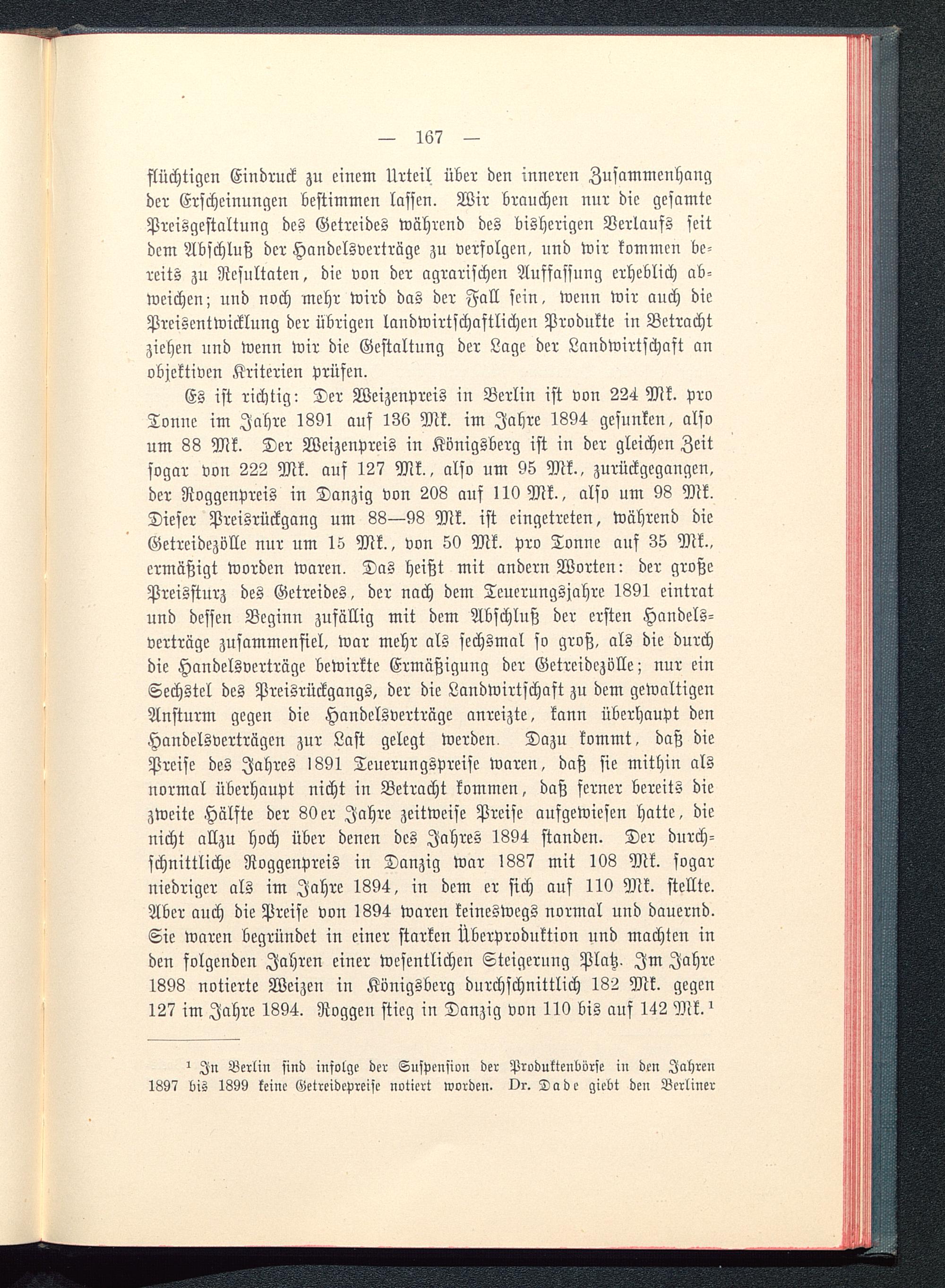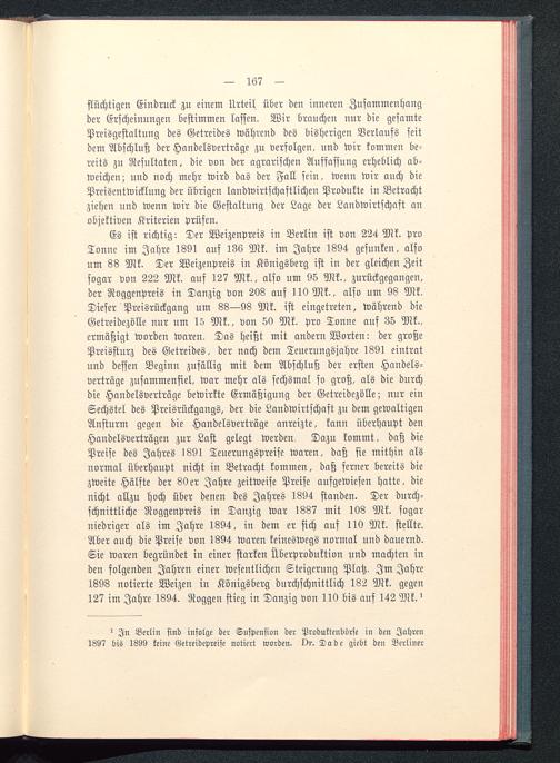 Es ist richtig: Der Weizenpreis in Berlin ist von 224 Mk. proTonne im Jahre 1891 auf 136 Mk. im Jahre 1894 gesunken, alsoum 88 Mk. Der Weizenpreis in Königsberg ist in der gleichen Zeitsogar von 222 Mk. auf 127 Mk., also um 95 Mk.. zurückgegangen,der Roggenpreis in Danzig von 208 auf 110 Mk., also um 98 Mk.Dieser Preisrückgang um 88—98 Mk. ist eingetreten, während dieGetreidezölle nur um 15 Mk., von 50 Mk. pro Tonne ans 35 Mk..ermäßigt worden waren. Das heißt mit andern Worten: der großePreissturz des Getreides, der nach dem Teuerungsjahre 1891 eintratund dessen Beginn zufällig mit dem Abschluß der ersten Handels-verträge zusammenfiel, war mehr als sechsmal so groß, als die durchdie Handelsverträge bewirkte Ermäßigung der Getreidezölle; nur einSechstel des Preisrückgangs, der die Landwirtschaft zu dem gewaltigenAnsturm gegen die Handelsverträge anreizte, kann überhaupt denHandelsverträgen zur Last gelegt werden. Dazu kommt, daß diePreise des Jahres 1891 Teuerungspreise waren, daß sie mithin alsnormal überhaupt nicht in Betracht kommen, daß ferner bereits diezweite Hälfte der 80 er Jahre zeitweise Preise aufgewiesen hatte, dienicht allzu hoch über denen des Jahres 1894 standen. Der durch-schnittliche Roggenpreis in Danzig war 1887 mit 108 Mk. sogarniedriger als im Jahre 1894, in dem er sich auf 110 Mk. stellte.Aber auch die Preise von l894 waren keineswegs normal und dauernd.Sie waren begründet in einer starken Überproduktion und machten inden folgenden Jahren einer wesentlichen Steigerung Platz. Im Jahre1898 notierte Weizen in Königsberg durchschnittlich 182 Mk. gegen127 im Jahre 1894. Roggen stieg in Danzig von 110 bis auf 142 Mk.'