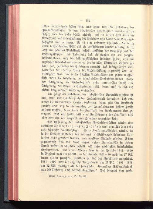 löhne entsprechend höher sein, und dann tritt die Erhöhung derProduktionskosten für den industriellen Unternehmer unmittelbar zuTage; oder der Lohn bleibt niedrig, und in diesem Fall wird dieErnährung und Lebenshaltung des Arbeiters und damit seine Leistungs-fähigkeit eine geringere. Es ist eine bekannte Thatsache, die durcheinen vergleichenden Blick auf die verschiedenen Länder bestätigt wird,daß ein gewisses Verhältnis besteht zwischen der Lohnhöhe und derLeistungsfähigkeit des Arbeiters; daß die Länder mit den höchstenArbeitslöhnen auch die leistungsfähigsten Arbeiter haben; und einenglischer Eiscnbahnunternehmer, der in allen Weltteilen Bahnen ge-bant hat, hat dabei die Erfahrung gemacht, daß infolge dieses Ver-hältnisses der effektive Preis der Arbeitsleistung eigentlich dort amniedrigsten war, wo er die höchsten Arbeitslöhne hat zahlen müssen.Also wenn die Erhöhung der industriellen Produktionskosten infolgeder Steigerung der Getreidepreise nicht unmittelbar durch eineSteigerung der Löhne in Erscheinung tritt, dann muß sie sich aufdiesem Weg indirekt Geltung verschaffen.