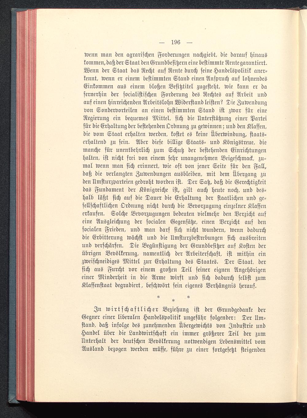 In wirtschaftlicher Beziehung ist der Grundgedanke derGegner einer liberalen Handelspolitik ungefähr folgender: Der Um-stand, daß infolge des zunehmenden Übergewichts von Industrie undHandel über die Landwirtschaft ein immer größerer Teil der zumUnterhalt der deutschen Bevölkerung notwendigen Lebensmittel vomAusland bezogen werden müsse, führe zu einer fortgesetzt steigenden