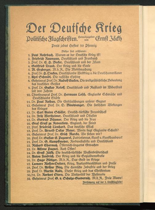 5S. Prof. vr. Arnold Oskar Meyer , Worin liegt Englands Schuld?59. Geheimrat Prof. vr. Erich Marcks , Wo stehen wir?20. prof.vr.Gustav E.pazaurek, Patriotismus,Kunstu.Kunsihandwerk25. Prof. vr. G. Kampffmeyer , Nordwestafrika und Deutschland