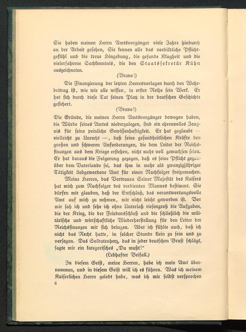 Die Finanzierung der letzten Heeresvorlagen durch den Wehr-beitrag ist, wie wir alle wissen, in erster Reihe sein Werk. Erhat sich durch diese Tat seinen Platz in der deutschen Geschichtegesichert.