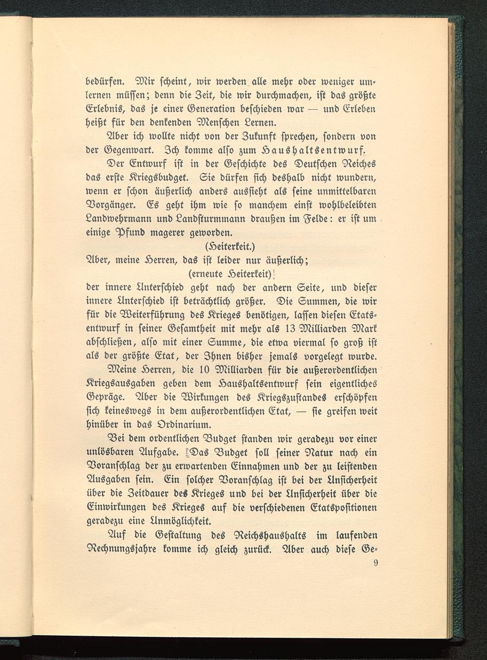 Der Entwurf ist in der Geschichte des Deutschen Reichesdas erste Kriegsbudget. Sie dürfen sich deshalb nicht wundern,wenn er schon äußerlich anders aussieht als seine unmittelbarenVorgänger. Es geht ihm wie so manchem einst wohlbeleibtenLandwehrmann und Landsturmmann draußen im Felde: er ist umeinige Pfund magerer geworden.