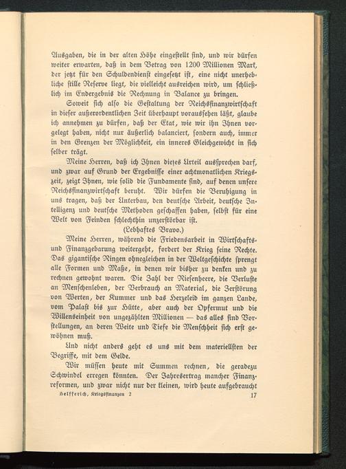 Meine Äerren, während die Friedensarbeit in Wirtschafts-und Finanzgebarung weitergeht, fordert der Krieg seine Rechte.Das gigantische Ringen ohnegleichen in der Weltgeschichte sprengtalle Formen und Maße, in denen wir bisher zu denken und zurechnen gewohnt waren. Die Zahl der Riesenheere, die Verlustean Menschenleben, der Verbrauch an Material, die Zerstörungvon Werten, der Kummer und das Äerzeleid im ganzen Lande,vom Palast bis zur Äütte, aber auch der Opfermut und dieWillenseinheit von ungezählten Millionen — das alles sind Vor-stellungen, an deren Weite und Tiefe die Menschheit sich erst ge-wöhnen muß.