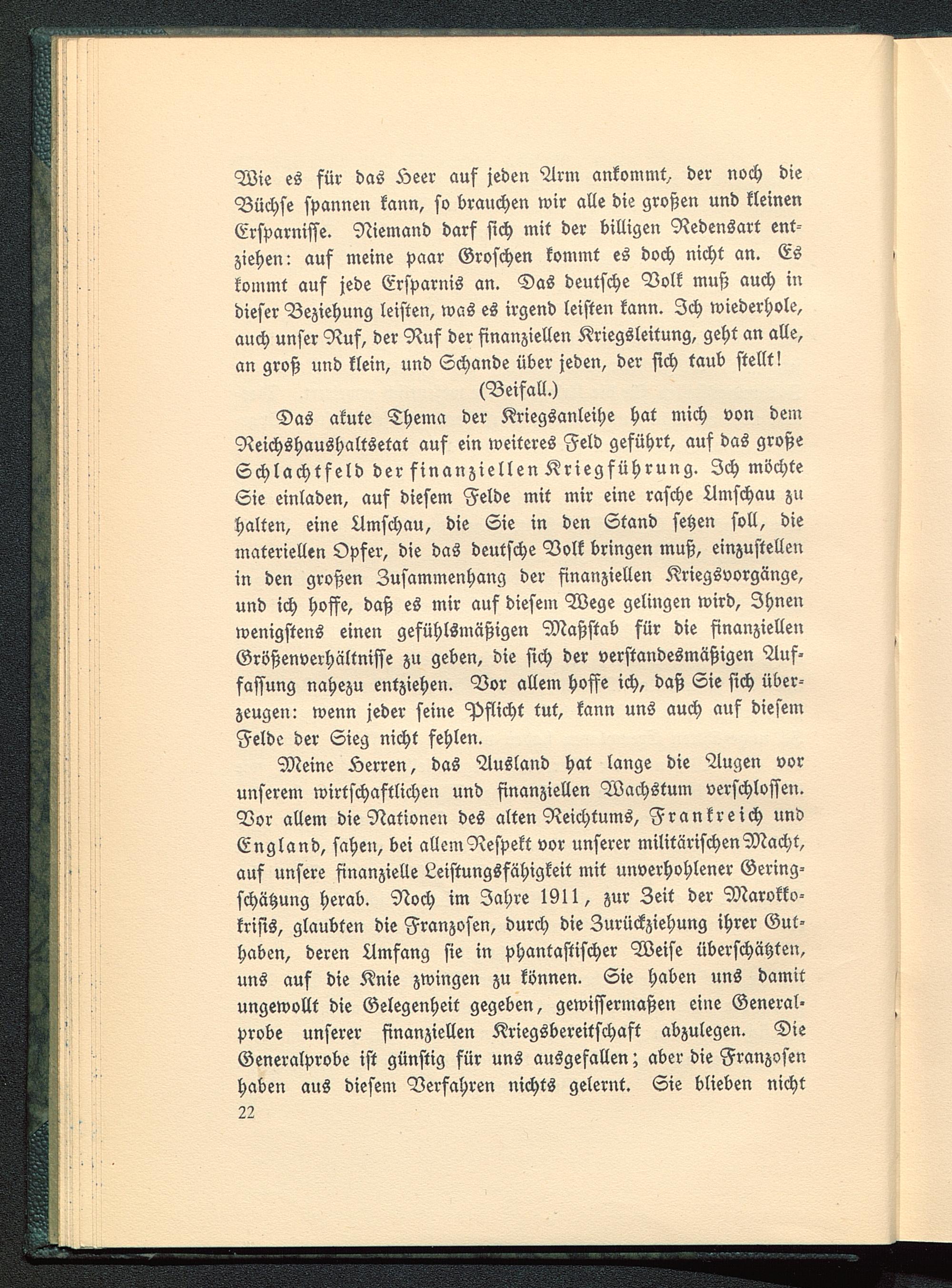 Meine Äerren, das Ausland hat lange die Augen vorunserem wirtschaftlichen und finanziellen Wachstum verschlossen.Vor allem die Nationen des alten Reichtums, Frankreich undEngland , sahen, bei allem Respekt vor unserer militärischen Macht,auf unsere finanzielle Leistungsfähigkeit mit unverhohlener Gering-schätzung herab. Noch im Jahre 1911, zur Zeit der Marokko-krisis, glaubten die Franzosen , durch die Zurückziehung ihrer Gut-haben, deren Amfang sie in phantastischer Weise überschätzten,uns auf die Knie zwingen zu können. Sie haben uns damitungewollt die Gelegenheit gegeben, gewissermaßen eine General-probe unserer finanziellen Kriegsbereitschaft abzulegen. DieGeneralprobe ist günstig für uns ausgefallen; aber die Franzosenhaben aus diesem Verfahren nichts gelernt. Sie blieben nicht
