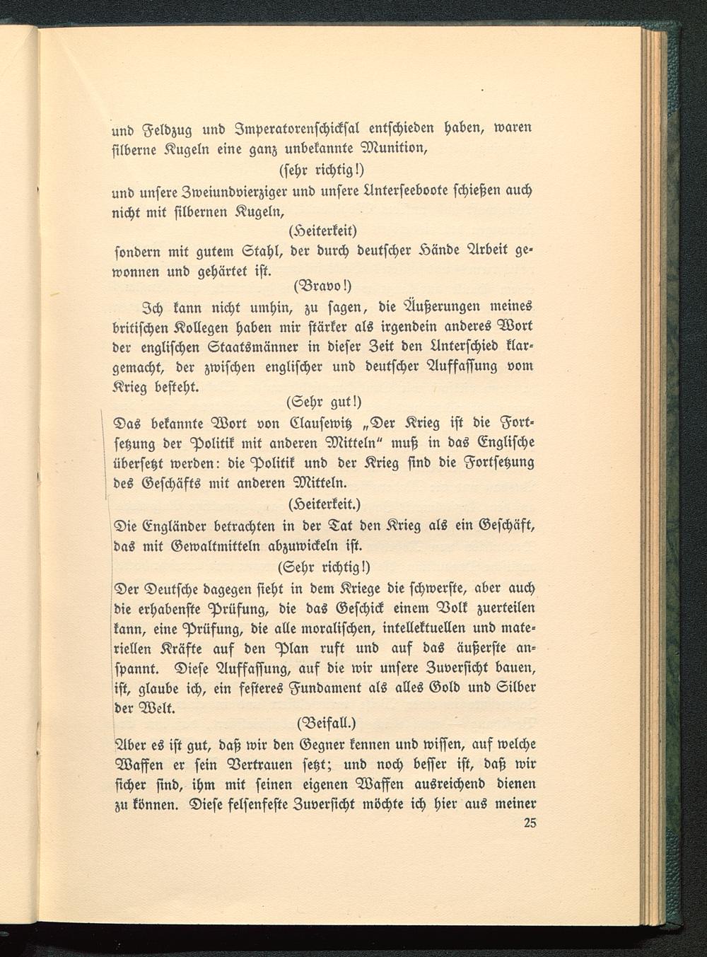 Der Deutsche dagegen sieht in dem Kriege die schwerste, aber auchidie erhabenste Prüfung, die das Geschick einem Volk zuerteilen! kann, eine Prüfung, die alle moralischen, intellektuellen und mate-riellen Kräfte auf den Plan ruft und auf das äußerste an-spannt. Diese Auffassung, auf die wir unsere Zuversicht bauen,ist, glaube ich, ein festeres Fundament als alles Gold und Silberder Welt.