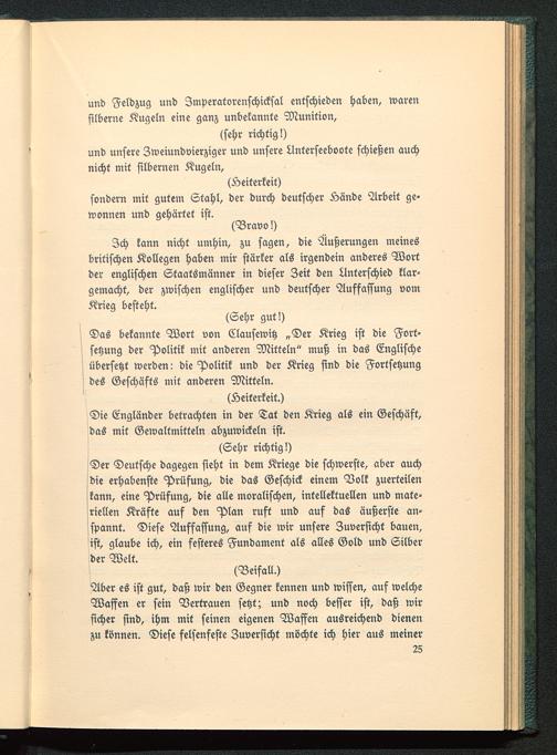 Ich kann nicht umhin, zu sagen, die Äußerungen meinesbritischen Kollegen haben mir stärker als irgendein anderes Wortder englischen Staatsmänner in dieser Zeit den Unterschied klar-gemacht, der zwischen englischer und deutscher Auffassung vomKrieg besteht.