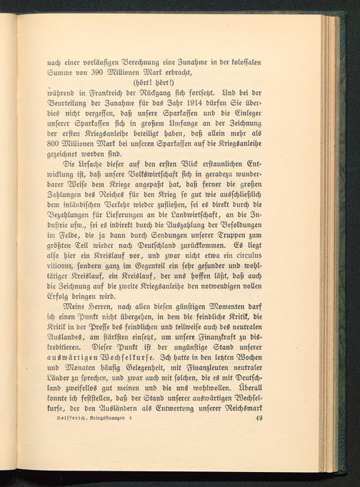 Die Ursache dieser auf den ersten Blick erstaunlichen Ent-wicklung ist, daß unsere Volkswirtschaft sich in geradezu wunder-barer Weise dem Kriege angepaßt hat, daß ferner die großenZahlungen des Reiches für den Krieg so gut wie ausschließlichdem inländischen Verkehr wieder zufließen, sei es direkt durch dieBezahlungen für Lieferungen an die Landwirtschaft, an die In-dustrie usw., sei es indirekt durch die Auszahlung der Besoldungenim Felde, die ja dann durch Sendungen unserer Truppen zumgrößten Teil wieder nach Deutschland zurückkommen. Es liegtalso hier ein Kreislauf vor, und zwar nicht etwa ein circulusvitiosus, sondern ganz im Gegenteil ein sehr gesunder und wohl-tätiger Kreislauf, ein Kreislauf, der uns hoffen läßt, daß auchdie Zeichnung auf die zweite Kriegsanleihe den notwendigen vollenErfolg bringen wird.