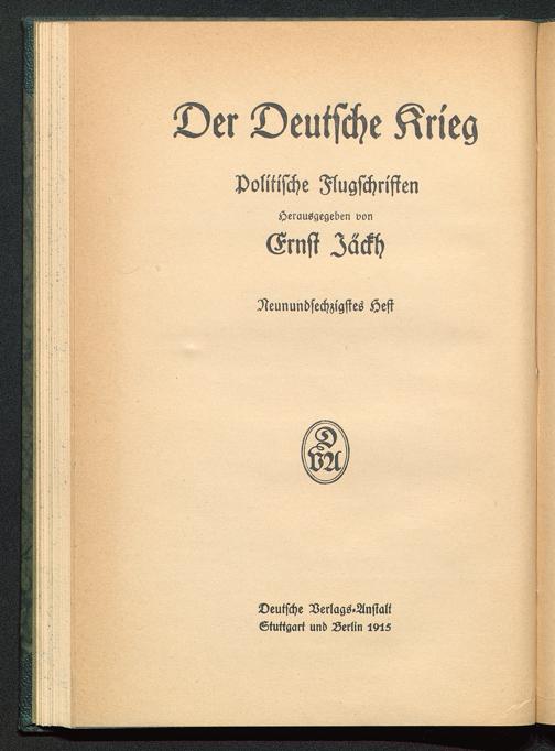 Deutsche Kriegpolitische FlugschristenHerausgegeben vonErnst ZackhNeunundsechzigstes HeftDeutsche Verlags.AnstaltStuttgart und Äerlin