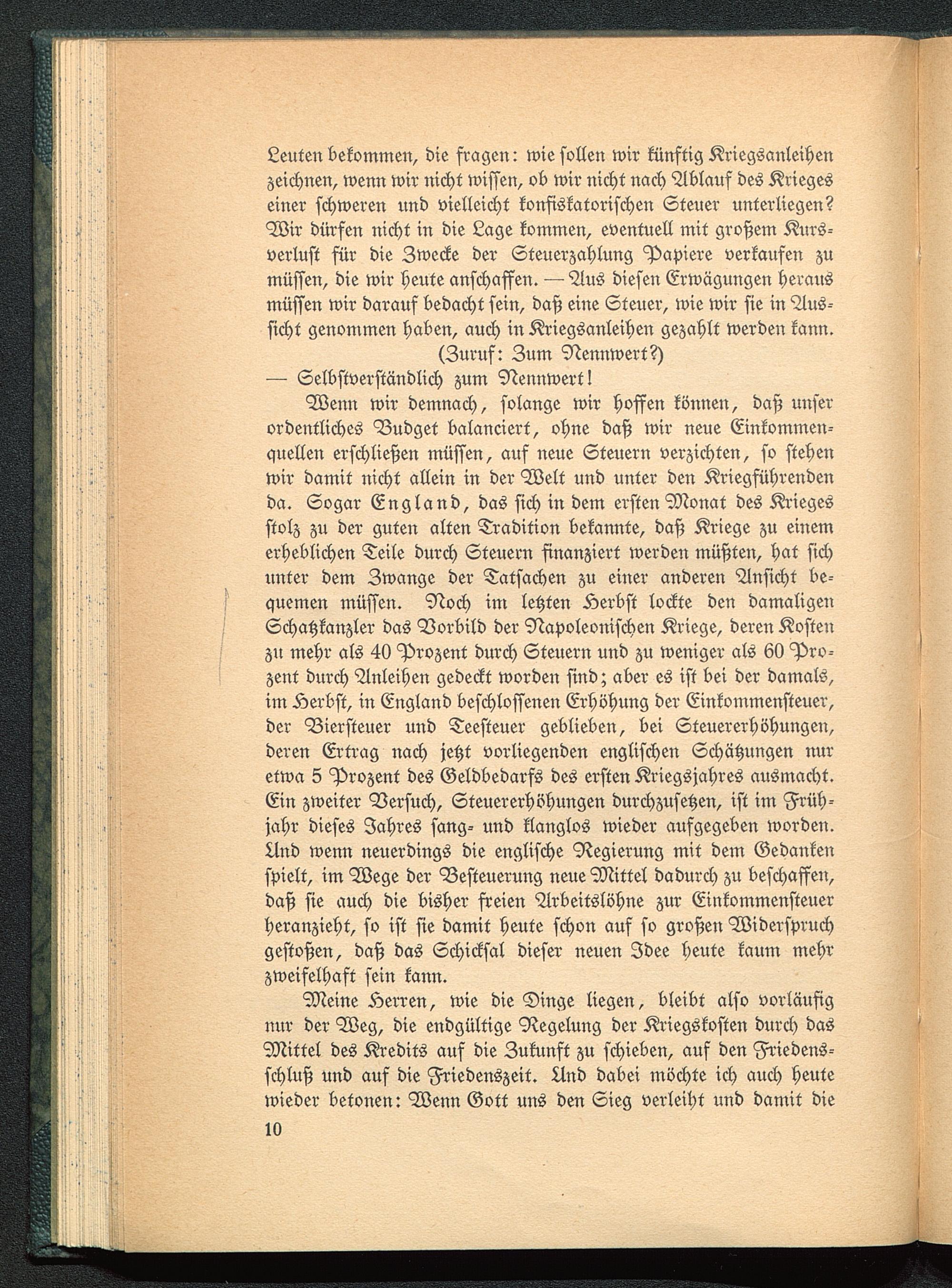 Meine Äerren, wie die Dinge liegen, bleibt also vorläufignur der Weg, die endgültige Regelung der Kriegskosten durch dasMittel des Kredits auf die Zukunft zu schieben, auf den Friedens-schluß und auf die Friedenszeit. And dabei möchte ich auch heutewieder betonen: Wenn Gott uns den Sieg verleiht und damit die