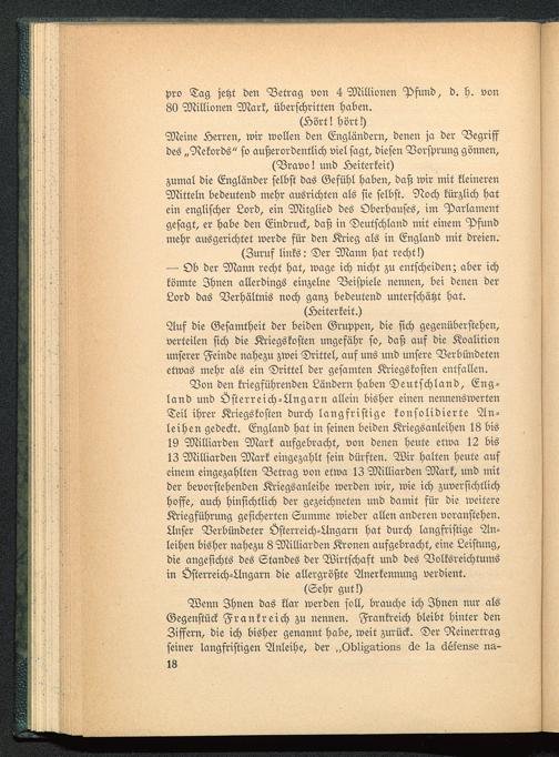 Auf die Gesamtheit der beiden Gruppen, die sich gegenüberstehen,verteilen sich die Kriegskosten ungefähr so, daß auf die Koalitionunserer Feinde nahezu zwei Drittel, auf uns und unsere Verbündetenetwas mehr als ein Drittel der gesamten Kriegskosten entfallen.