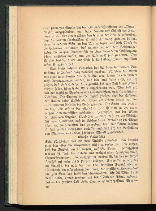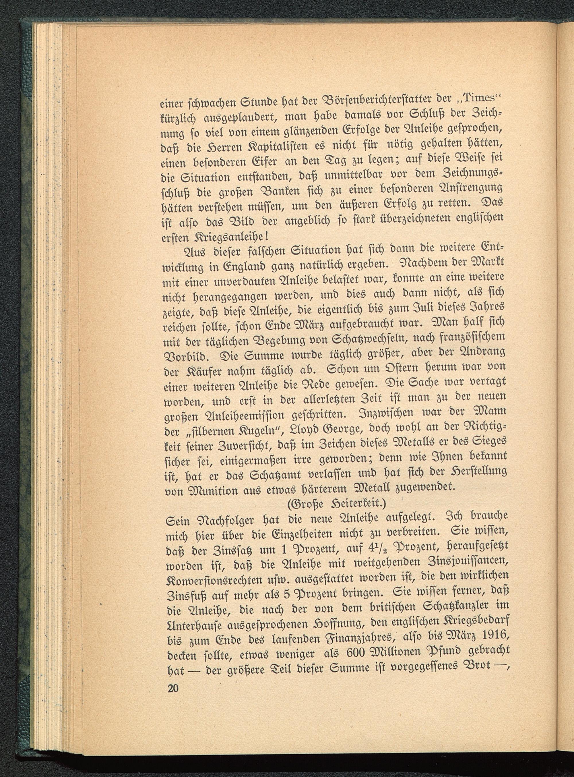 (Große Heiterkeit.)Sein Nachfolger hat die neue Anleihe aufgelegt. Ich brauchemich hier über die Einzelheiten nicht zu verbreiten. Sie wissen,daß der Zinssatz um 1 Prozent, auf 4^2 Prozent, heraufgesetztworden ist, daß die Anleihe mit weitgehenden Zinsjouissancen,Konversionsrechten usw. ausgestattet worden ist, die den wirklichenZinsfuß auf mehr als 5 Prozent bringen. Sie wissen ferner, daßdie Anleihe, die nach der von dem britischen Schatzkanzler imAnterhause ausgesprochenen Hoffnung, den englischen Kriegsbedarfbis zum Ende des laufenden Finanzjahres, also bis März 1916,decken sollte, etwas weniger als 600 Millionen Psund gebrachthat — der größere Teil dieser Summe ist vorgegessenes Brot —,