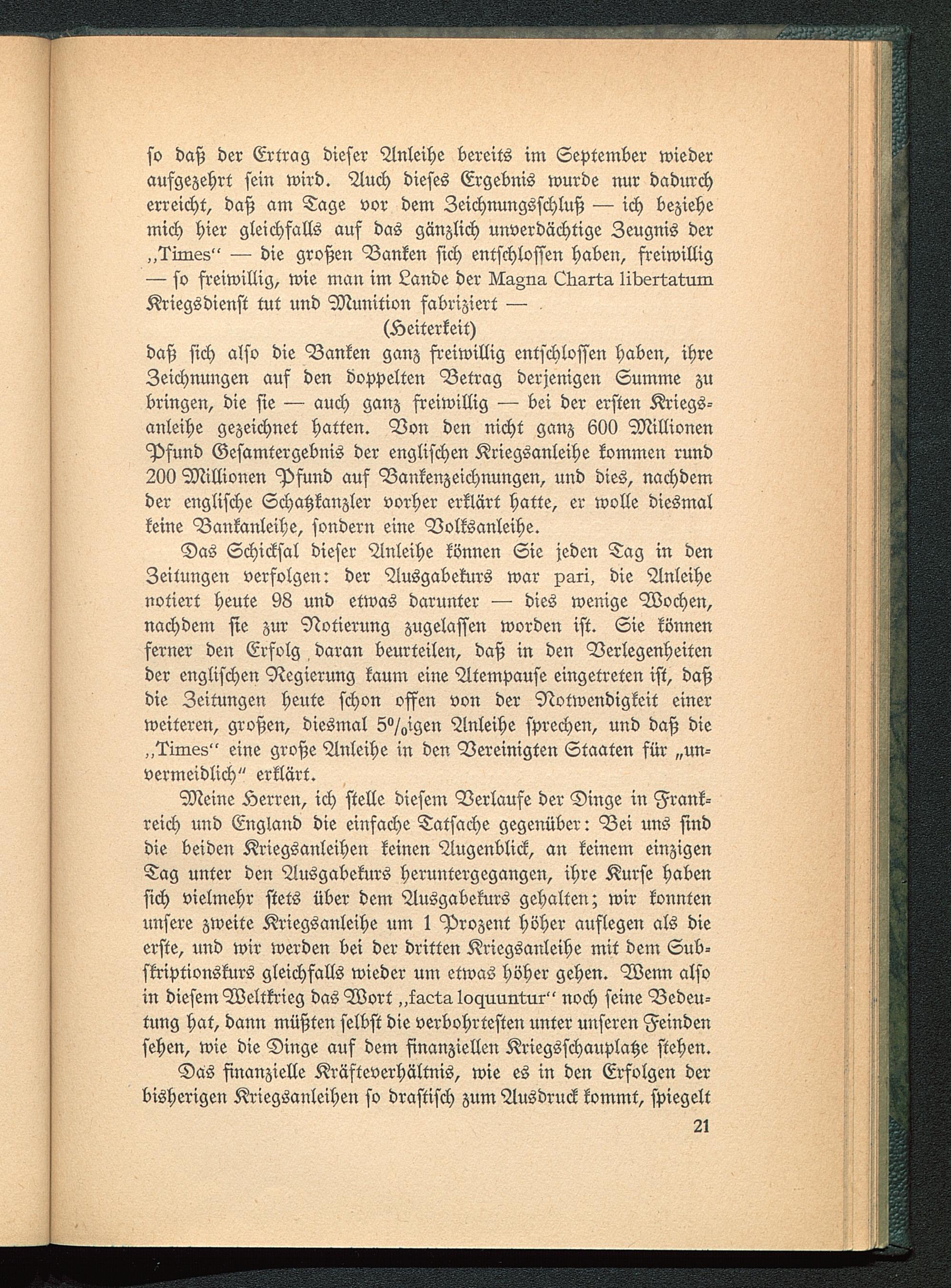 Meine Äerren, ich stelle diesem Verlaufe der Dinge in Frank-reich und England die einfache Tatsache gegenüber: Bei uns sinddie beiden Kriegsanleihen keinen Augenblick, an keinem einzigenTag unter den Ausgabekurs heruntergegangen, ihre Kurse habensich vielmehr stets über dem Ausgabekurs gehalten; wir konntenunsere zweite Kriegsanleihe um 1 Prozent höher auflegen als dieerste, und wir werden bei der dritten Kriegsanleihe mit dem Sub-skriptionskurs gleichfalls wieder um etwas höher gehen. Wenn alsoin diesem Weltkrieg das Wort „kacta 1vHuu.n5nr" noch seine Bedeu-tung hat, dann müßten selbst die verbohrtesten unter unseren Feindensehen, wie die Dinge auf dem finanziellen Kriegsschauplätze stehen.