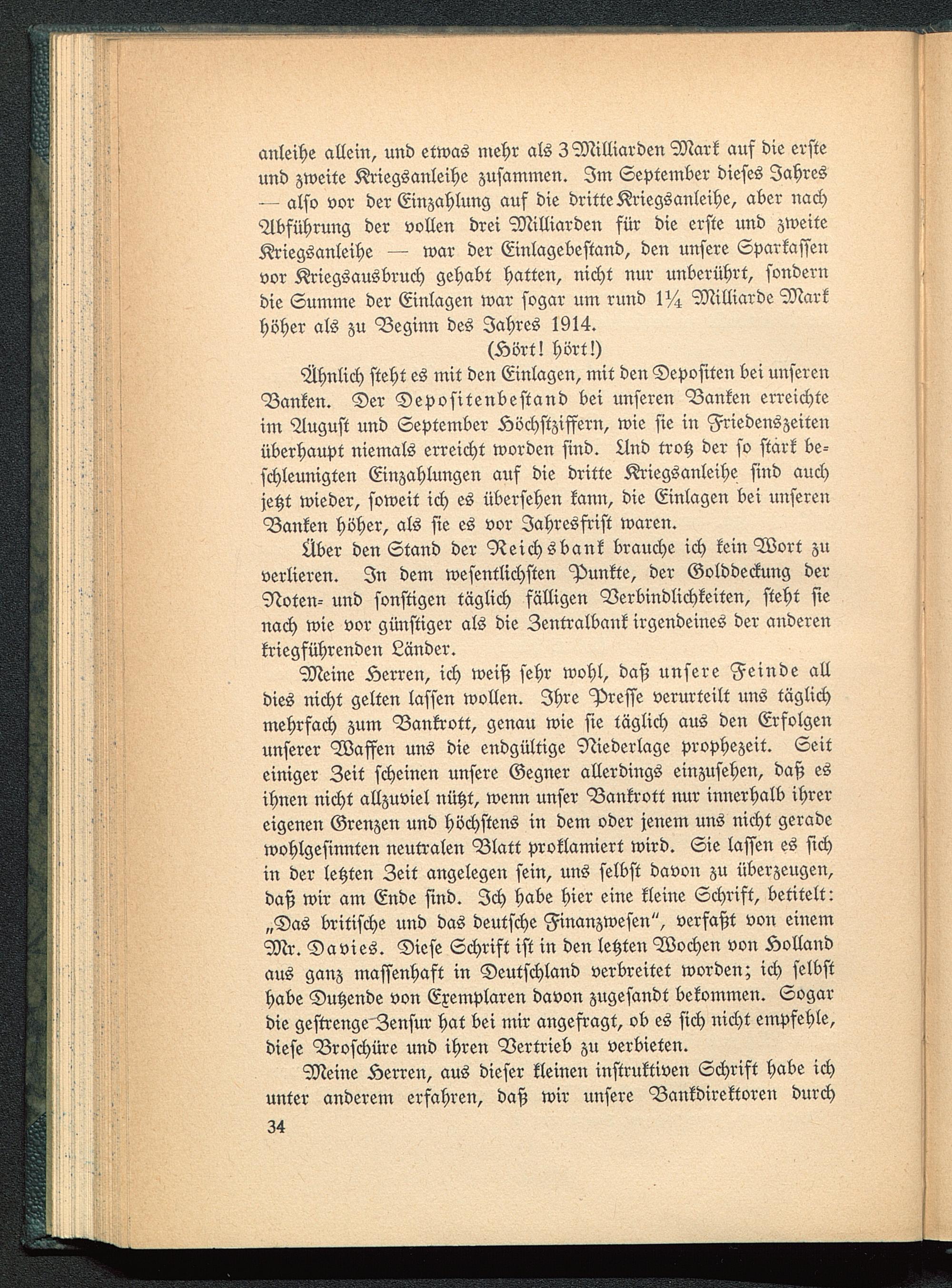 Meine Herren, ich weiß sehr wohl, daß unsere Feinde alldies nicht gelten lassen wollen. Ihre Presse verurteilt uns täglichmehrfach zum Bankrott, genau wie sie täglich aus den Erfolgenunserer Waffen uns die endgültige Niederlage prophezeit. Seiteiniger Zeit scheinen unsere Gegner allerdings einzusehen, daß esihnen nicht allzuviel nützt, wenn unser Bankrott nur innerhalb ihrereigenen Grenzen und höchstens in dem oder jenem uns nicht geradewohlgesinnten neutralen Blatt proklamiert wird. Sie lassen es sichin der letzten Zeit angelegen sein, uns selbst davon zu überzeugen,daß wir am Ende sind. Ich habe hier eine kleine Schrift, betitelt:„Das britische und das deutsche Finanzwesen", versaßt von einemMr. Davies. Diese Schrift ist in den letzten Wochen von Holland aus ganz massenhaft in Deutschland verbreitet worden; ich selbsthabe Dutzende von Exemplaren davon zugesandt bekommen. Sogardie gestrenge Zensur hat bei mir angefragt, ob es sich nicht empfehle,diese Broschüre und ihren Vertrieb zu verbieten.