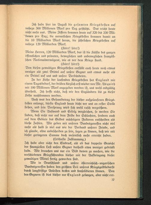 Wir in Deutschland und unsere österreichisch-ungarischenBundesgenossen haben den größten Teil unseres Kriegsgeldbedarfsdurch langfristige Anleihen decken und konsolidieren können. Vonden Gegnern ist dies bisher nur England gelungen, aber nicht ent-