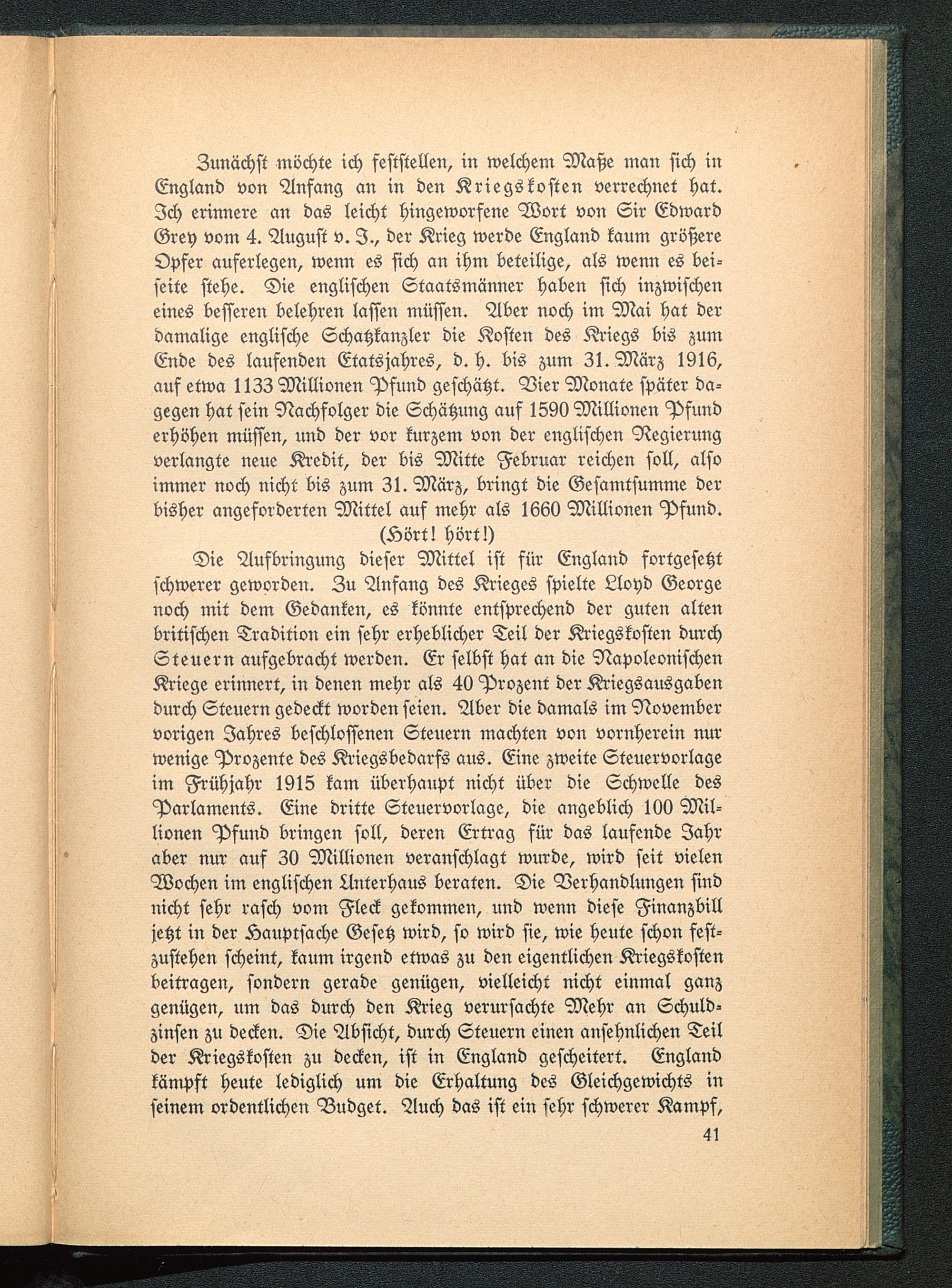 Zunächst möchte ich feststellen, in welchem Maße man sich inEngland von Anfang an in den Kriegskosten verrechnet hat.Ich erinnere an das leicht hingeworfene Wort von Sir EdwardGrey vom 4. August v. I>, der Krieg werde England kaum größereOpfer auferlegen, wenn es sich an ihm beteilige, als wenn es bei-seite stehe. Die englischen Staatsmänner haben sich inzwischeneines besseren belehren lassen müssen. Aber noch im Mai hat derdamalige englische Schatzkanzler die Kosten des Kriegs bis zumEnde des laufenden Etatsjahres, d.h. bis zum 31. März 1916,auf etwa 1133 Millionen Pfund geschätzt. Vier Monate später da-gegen hat sein Nachfolger die Schätzung auf 1590 Millionen Pfunderhöhen müssen, und der vor kurzem von der englischen Regierungverlangte neue Kredit, der bis Mitte Februar reichen soll, alsoimmer noch nicht bis zum 31. März, bringt die Gesamtsumme derbisher angeforderten Mittel auf mehr als 1660 Millionen Pfund.