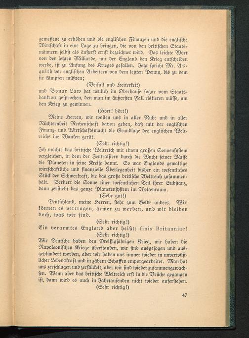 Wir Deutsche haben den Dreißigjährigen Krieg, wir haben dieNapoleonischen Kriege überstanden, wir sind ausgesogen und aus-geplündert worden, aber wir haben uns immer wieder in unverwüst-licher Lebenskraft und in zähem Schaffen emporgearbeitet. Man hatuns zerschlagen und zerstückelt, aber wir sind wieder zusammengewach-sen. Wenn aber das britische Weltreich erst in die Brüche gegangenist, dann wird es auch in Jahrtausenden nicht wieder auferstehen.