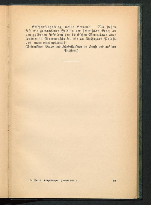 Erschöpfungskrieg, meine Äerren? — Wir stehenfest wie gewachsener Fels in der heimischen Erde; anden goldenen Pfeilern des britischen Weltreiches aberleuchtet in Flammenschrift, wie an Belsazars Palast,das „inerie tekel npliarsiri!"