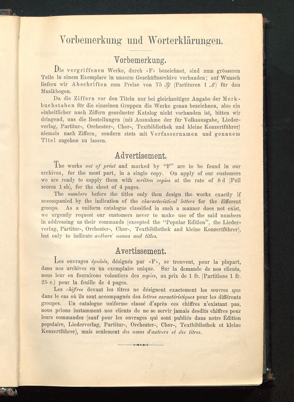 The numlers before the titles only then design the works exactly ifaccompanied by the indication of the characteristical letters for the differentgroups. As a uniform catalogue classified in such a manner does not exist,we urgently request our customers never to make use of the said numbersin addressing us their commands (excepted the "Populär Edition", the Lieder-verlag, Partitur -, Orchester-, Chor-, Textbibliothek and kleine Konzertführer),but only to indicate authors' names and titles.