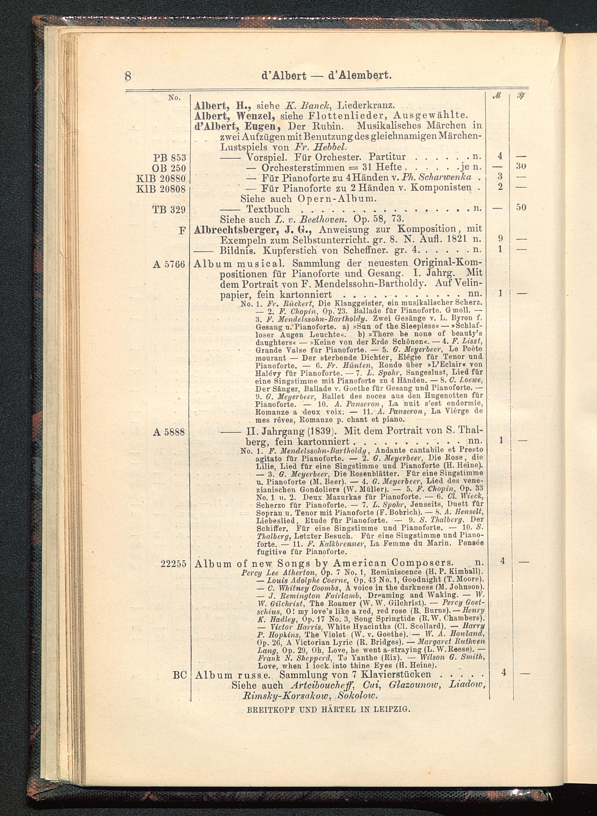 Album musical. Sammlung der neuesten Original-Kom-positionen für Pianoforte und Gesang. I. Jahrg. Mitdem Portrait von F. Mendelssohn-Bartholdy . Auf Velin-papier, fein kartonniert............nn.