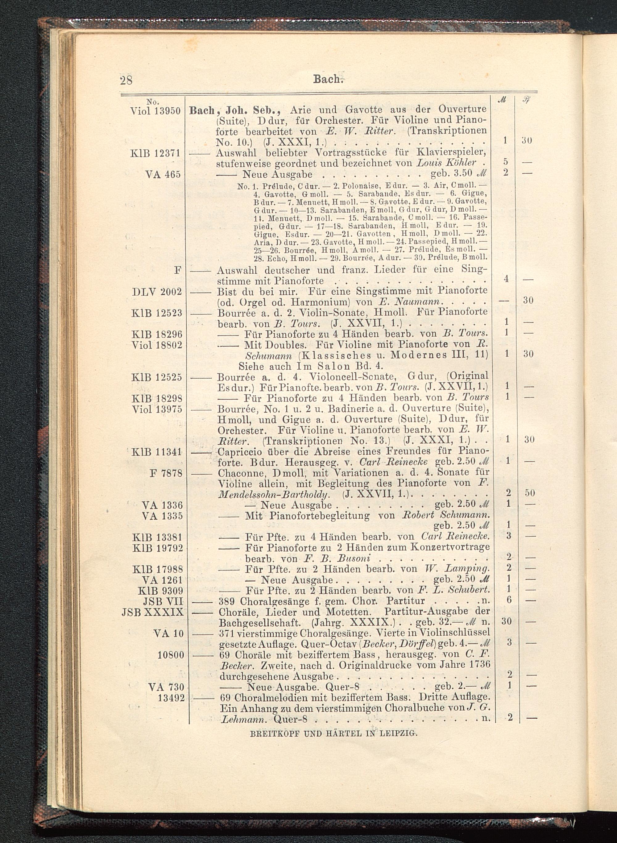 Bitter. (Transkriptionen No. 13.) (J. XXXI, l.J . .- Capriccio über die Abreise eines Freundes für Piano-forte. Bdur. Herausgeg. v. Carl Beinecke geb. 2.50 Jl- Chaconne, Dmoll, mit Variationen a. d. 4. Sonate für