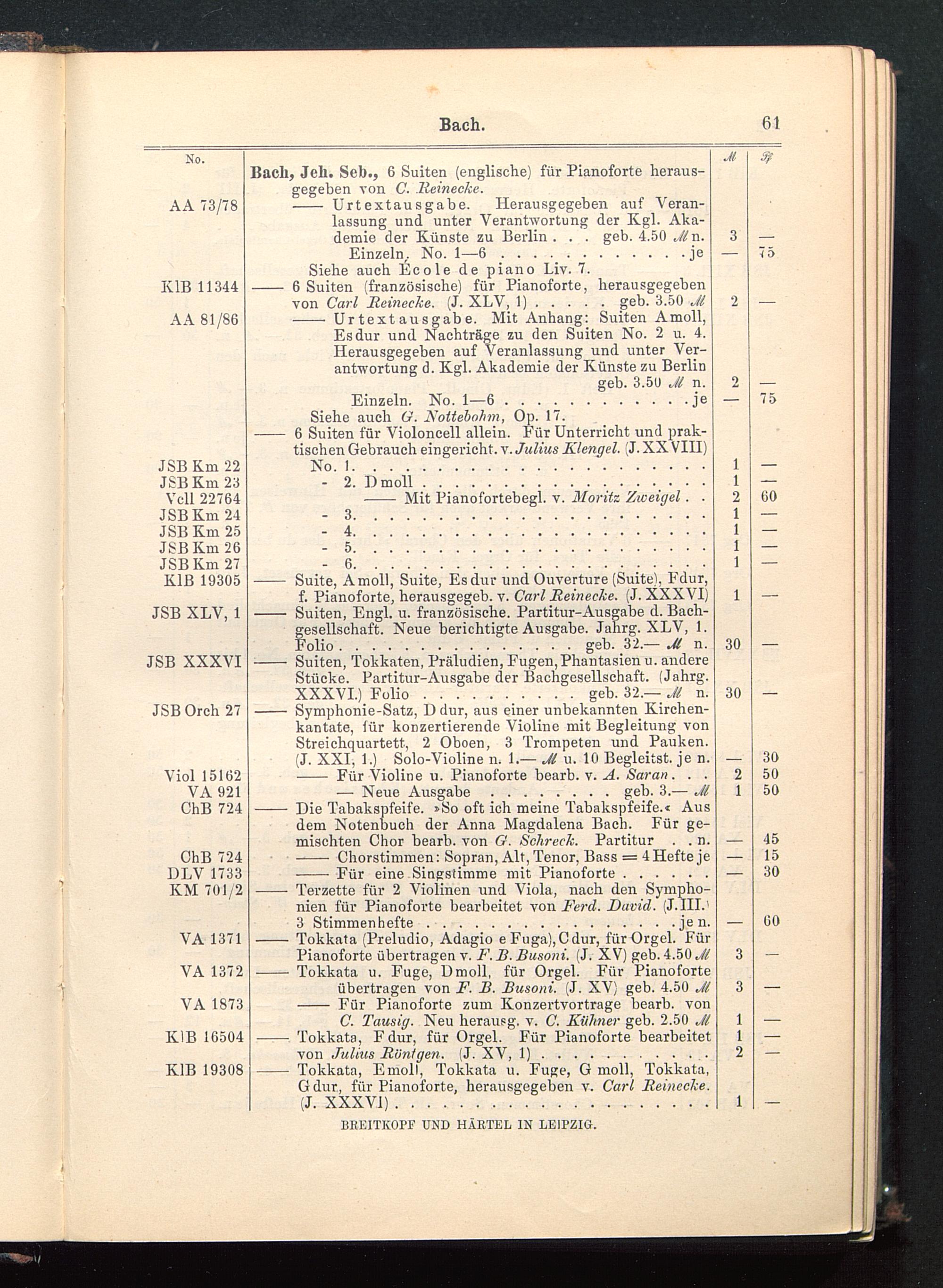 - Suiten, Engl. u. französische. Partitur-Ausgabe d. Bach-gesellschaft. Neue berichtigte Ausgabe. Jahrg. XLV, 1.Folio...............geb. 32.— Jl n.