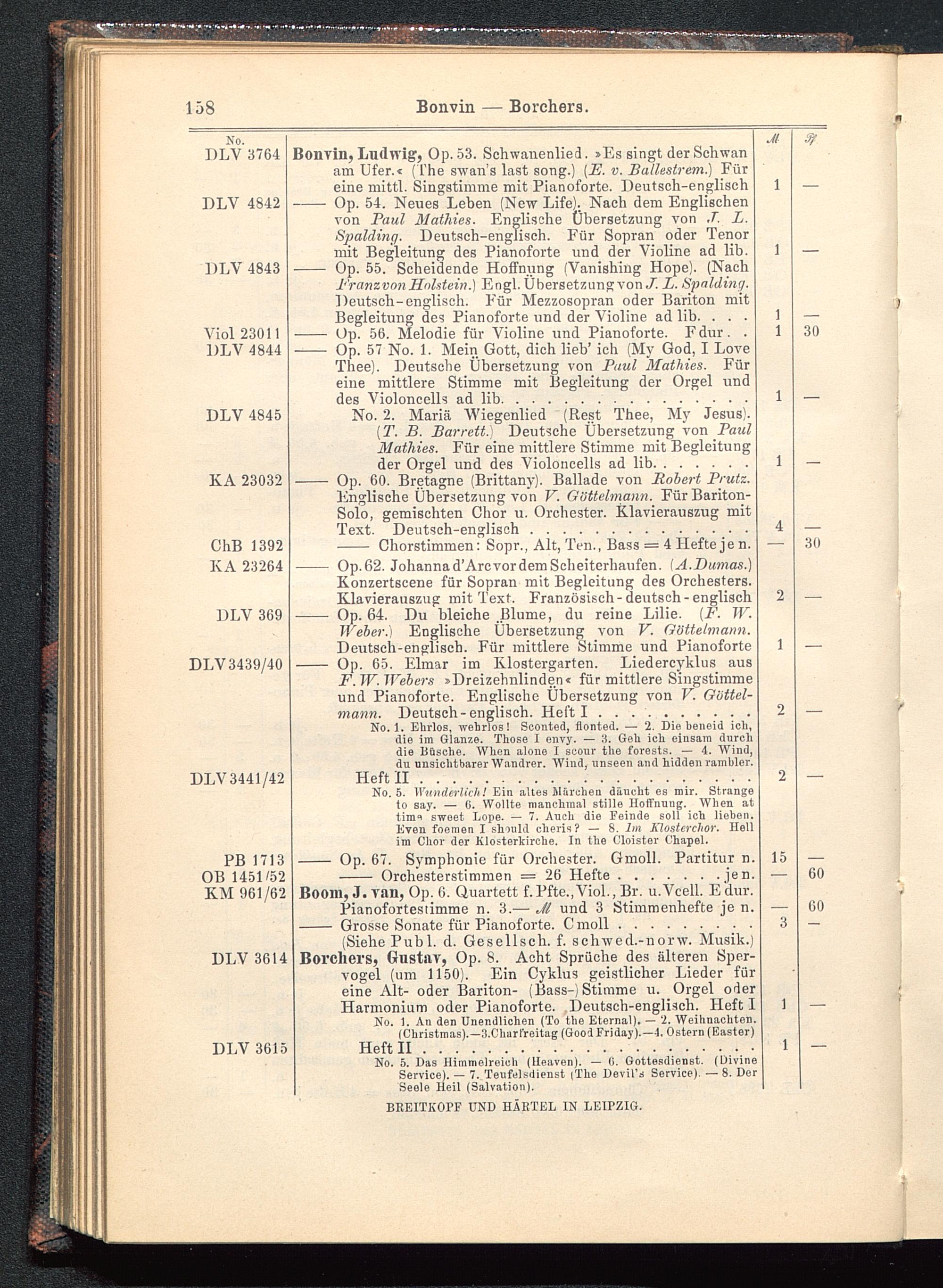 Borchers, Gustav, Op. 8. Acht Sprüche des älteren Sper-vogel (um 1150). Ein Cyklus geistlicher Lieder füreine Alt- oder Bariton- (Bass-) Stimme u. Orgel oderHarmonium oder Pianoforte. Deutsch -englisch. Heft INo. 1. An den Unendlichen (To the Eternal). — '2. Weihnachten.(Christmas).—3.Charl'reitag (Good Frida)').—•1. Ostern (Eastor)