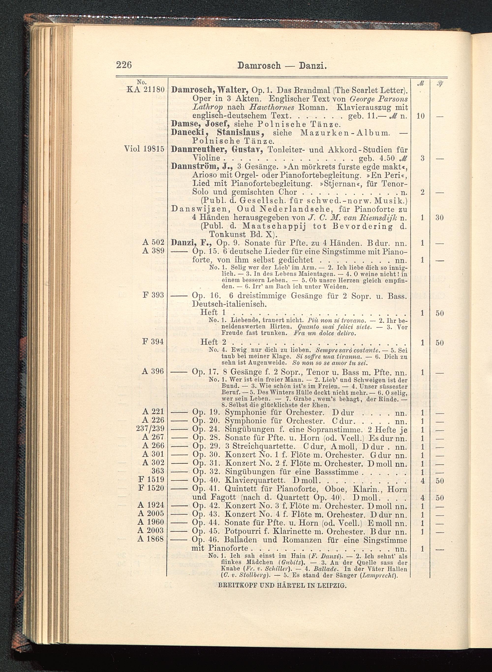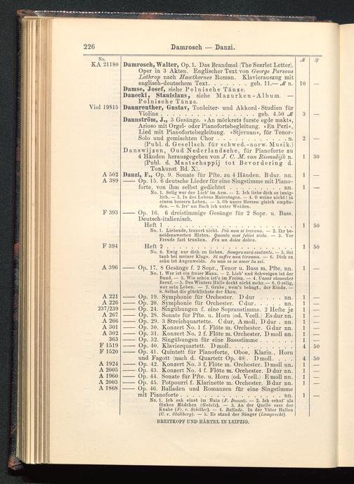 (Publ. d. Gesellseh. für schwed.-norw. Musik.)Danswijzen, Oud Nederlandsche, für Pianoforte zu4 Händen herausgegeben von J. C. M. van Riemsäijk n.(Publ. d. Maatschappij tot Bevordering d.Tonkunst Bd. X).Danzi, F., Op. 9. Sonate für Pfte. zu 4 Händen. Bdur. nn.- Op. 15. 6 deutsche Lieder für eine Singstimme mit Piano-forte, von ihm selbst gedichtet.........nn.