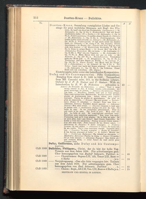 Einzelauggabe siehe unter den betreffenden Komponisten.Dufay and his Contemporaries. Fifty Compositions(Ranging from about A. D. 1400 to 1440), Transcribedfrorn MS. Canonici misc. 213, in the Bodleian Library, Oxford by J. F. R. Stäiner and C. Stainer. With anIntroduction by JB. W. J3. Nicholson . . gebunden n.