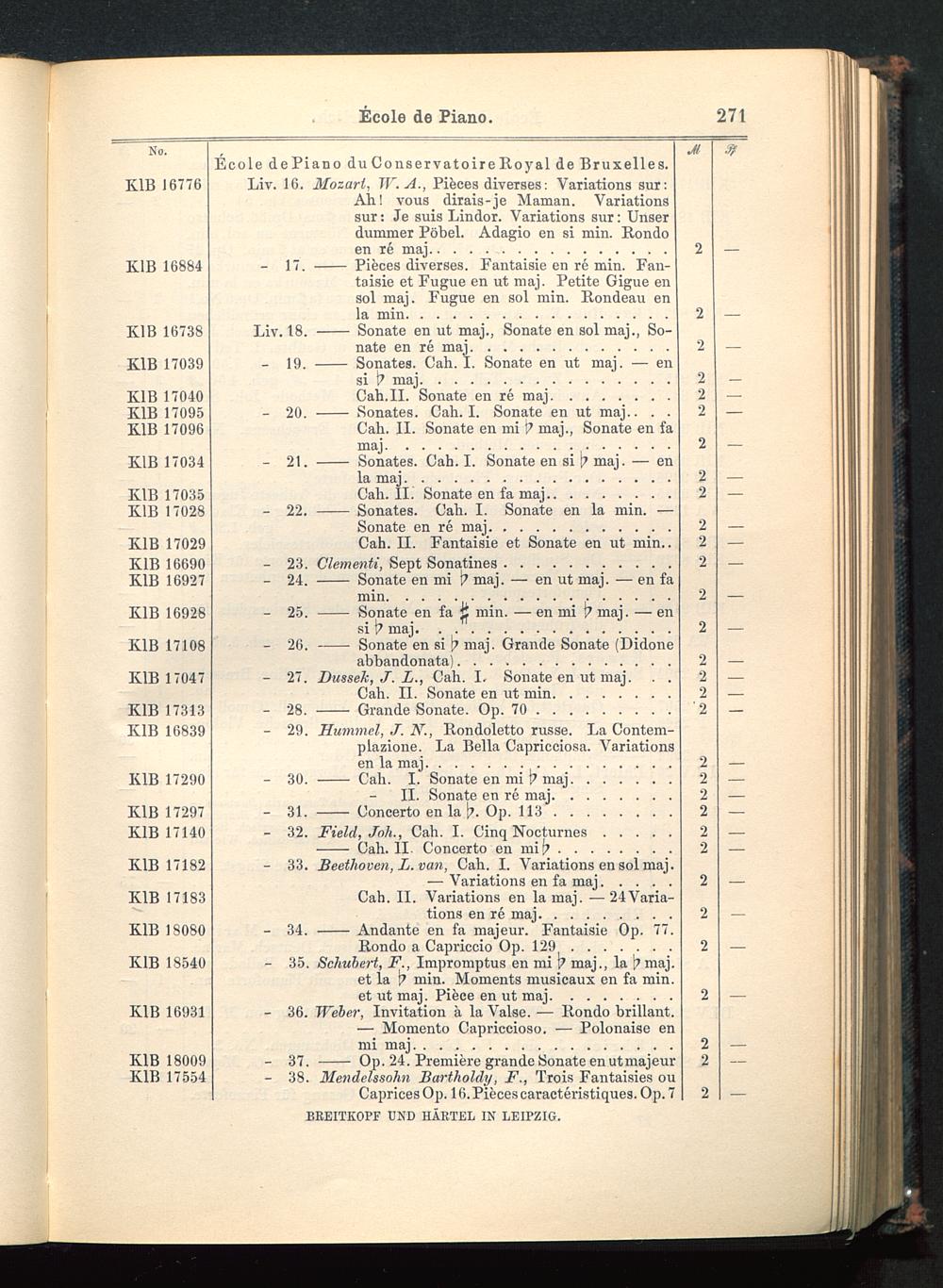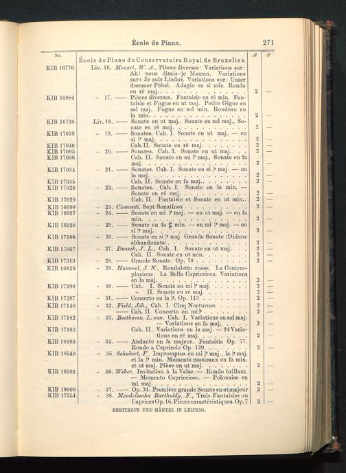 Ecole dePiano du Conservatoire Royal de Bruxelles.Liv. 16. Mozart , W.A., Pieces diverses: Variations Sur:Ah! vous dirais-je Maman. Variationssur: Je suis Lindor. Variations sur: Unserdummer Pöbel. Adagio en si min. Rondoen re maj................