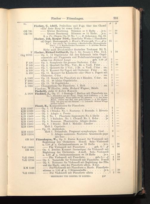 S. a. Fr. Chopin , Op. 25 No. 7. — R. Schumann, Op. 12.Fischer, Joh. Kaspar Ferd., Sämtliche Werke f. Pianoforteod. Orgel. Herausgegeb. v. Ernst v. Werra geb. 17.— Jl n.No. 1. Lea pieces de Clavessin (»Musikalisches Blumenbüsch-lein«). — 2. Musikalischer Parnassus. — 3. Ariadno Musica.— 4. Bluroen-Strauss.