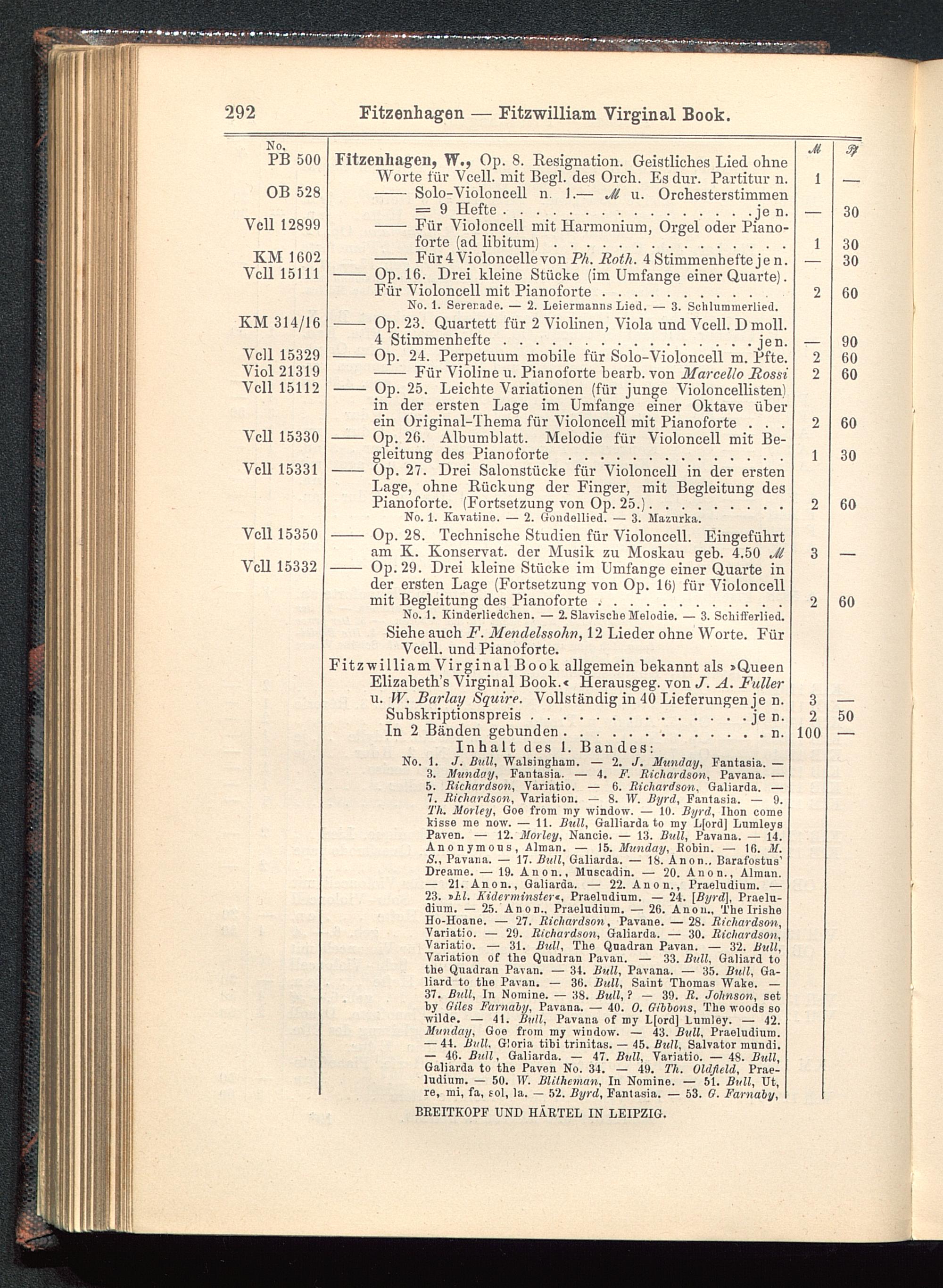 Siehe auch F. Mendelssohn , 12 Lieder ohne Worte. FürVcell. und Pianoforte.Fitzwilliam Virginal Book allgemein bekannt als »QueenElizabeths Virginal Book.< Herausgeg. von J. A. Fülleru. IV. Barlay Squire. Vollständig in 40 Lieferungen je n.