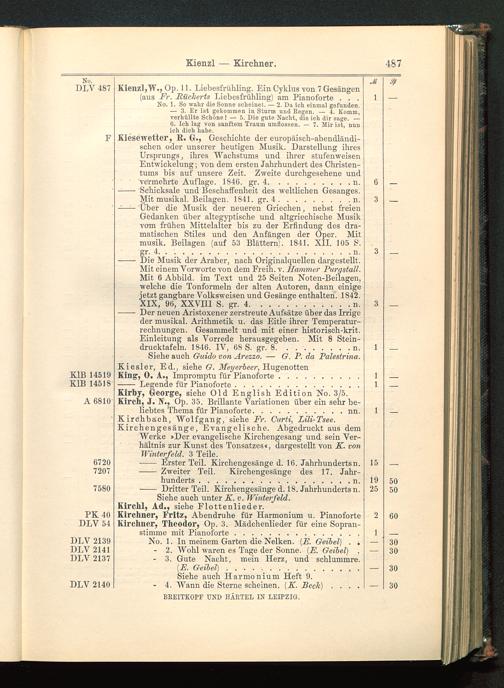 Kiesewetter, K. (}•, Geschichte der europäisch-abendländi-schen oder unserer heutigen Musik. Darstellung ihresUrsprungs, ihres Wachstums und ihrer stufenweisenEntwickelung; von dem ersten Jahrhundert des Christen-tums bis auf unsere Zeit. Zweite durchgesehene undvermehrte Auflage. 1846. gr. 4..........n.