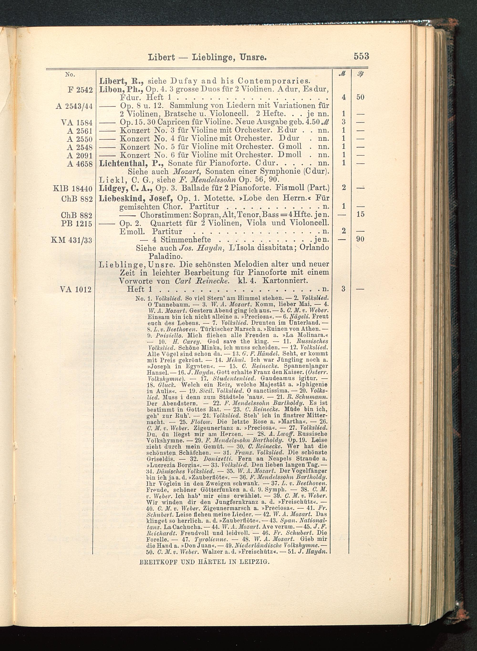 Siehe auch Mozart, Sonaten einer Symphonie (Cdur).Lickl, C. G., siehe F. Mendelssohn Op. 56, 90.Lidgey, C. A., Op. 3. Ballade für 2 Pianoforte. Fismoll (Part.)Liebeskind, Josef, Op. 1. Motette. »Lobe den Herrn.« Für
