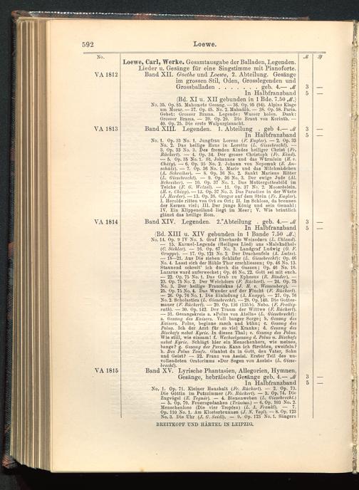 In Halbfranzband(Bd. XI u. XII gebunden in 1 Bde. 7.50 Jl.)No. 35. Op. 85. Mahomets Gesang. — 30. Op. 95 (94). Alpins Klageum Morar. — 37. Op. 45. No. 2. Hahadöh. — 38. Op. 58. Paria.Gebet: Grosser Brama. Legende: Wasser holen. Dank:Grosser Brama. — 39. Op. 29. Dio Braut von Korinth. —40. Op. 25. Die erste Walpurgisnacht.Band XIII. Legenden. 1. Abteilung . geb 4.— Jl