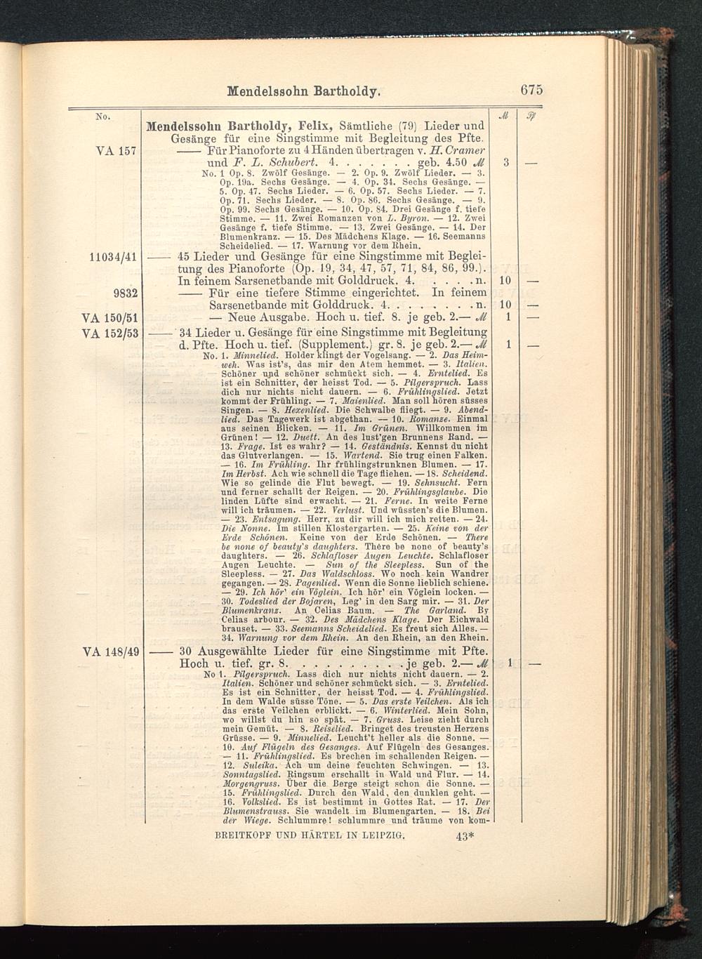 No. 1 Op. 8. Zwölf Gesänge. — 2, Op. 9. Zwölf Lieder. — 3.Op. 19a. Sechs Gesänge. — 4. Op. 34. Sechs Gesänge. —5. Op. 47. Sechs Lieder. — 6. Op. 57. Sechs Lieder. — 7.Op. 71. Sechs Lieder. — 8. Op. 86. Sechs Gesänge. — 9.Op. 09. Sechs Gesänge. — 10. Op. 84. Drei Gesänge f. tiefeStimme. — Ii. Zwei Romanzen von L. Byron. — 12. ZweiGesänge f. tiefe Stimme. — 13. Zwei Gesängo. — 14. DerBlumenkranz. — 15. Des Mädchens Klage. — 16. SeemannsScheidelied. — 17. Warnung vor dem Ithein.