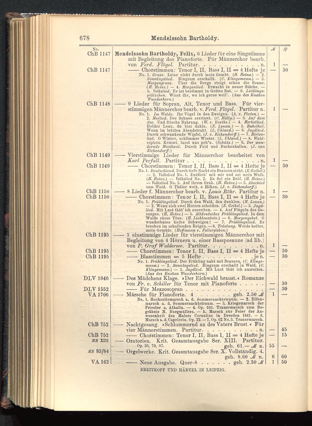 — 2. Wenn sich zwei Herzen scheiden. (E. Geibel .) — 3. Jagd-lied. Mit Lust thät' ich ausreiten. — 4. Auf Flügeln des Ge-sanges. (H. Heine .) — 5. Altdeutsches Frühlingslied. In demWalde süsse Töne. (H. Lichtenstein.) — 6. Morgengebet. 0wunderbares tiefes Schweigen! — 7. Frühlingslied. Esbrechen im schallenden Reigen. — 8. Tröstung. Werde heiter,mein Gemüte. (Hoffmann v. Fallersleben .)