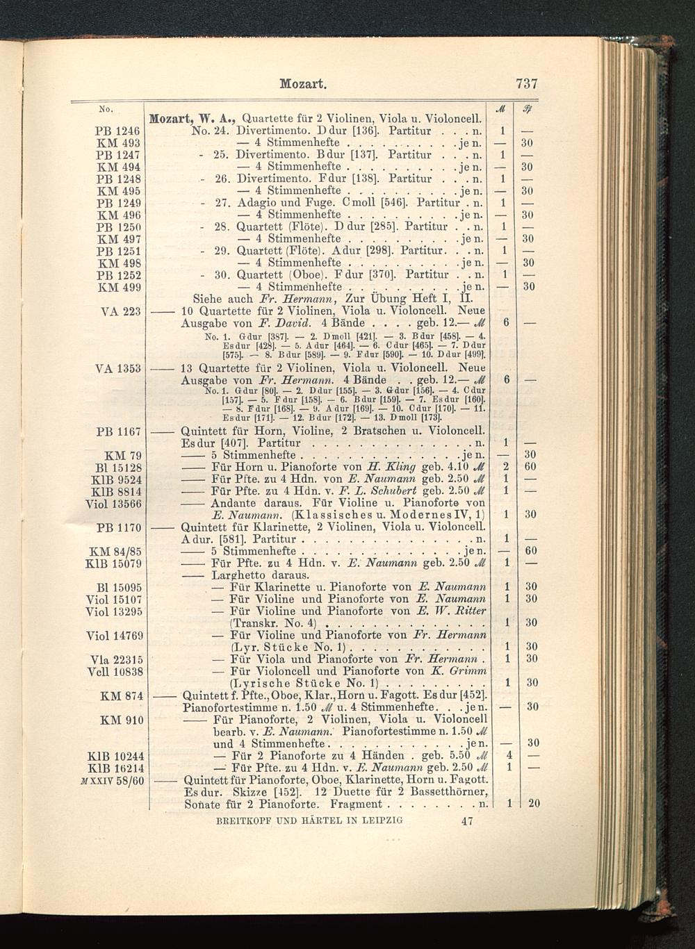 10 Quartette für 2 Violinen, Viola u. Violoncell . NeueAusgabe von F. David. 4 Bände .... geb. 12.-— JlNo. 1. Gaur [387]. — 2. Dmoll [421]. — 3. Bdur [458]. — 4.Esdur [428]. — 5. Adur [464]. — 6. Cdur [465]. — 7. Ddnr[575]. — 8. Bdur [58!)]. — 9. Fdur [590]. — 10. Ddur [4!)9].
