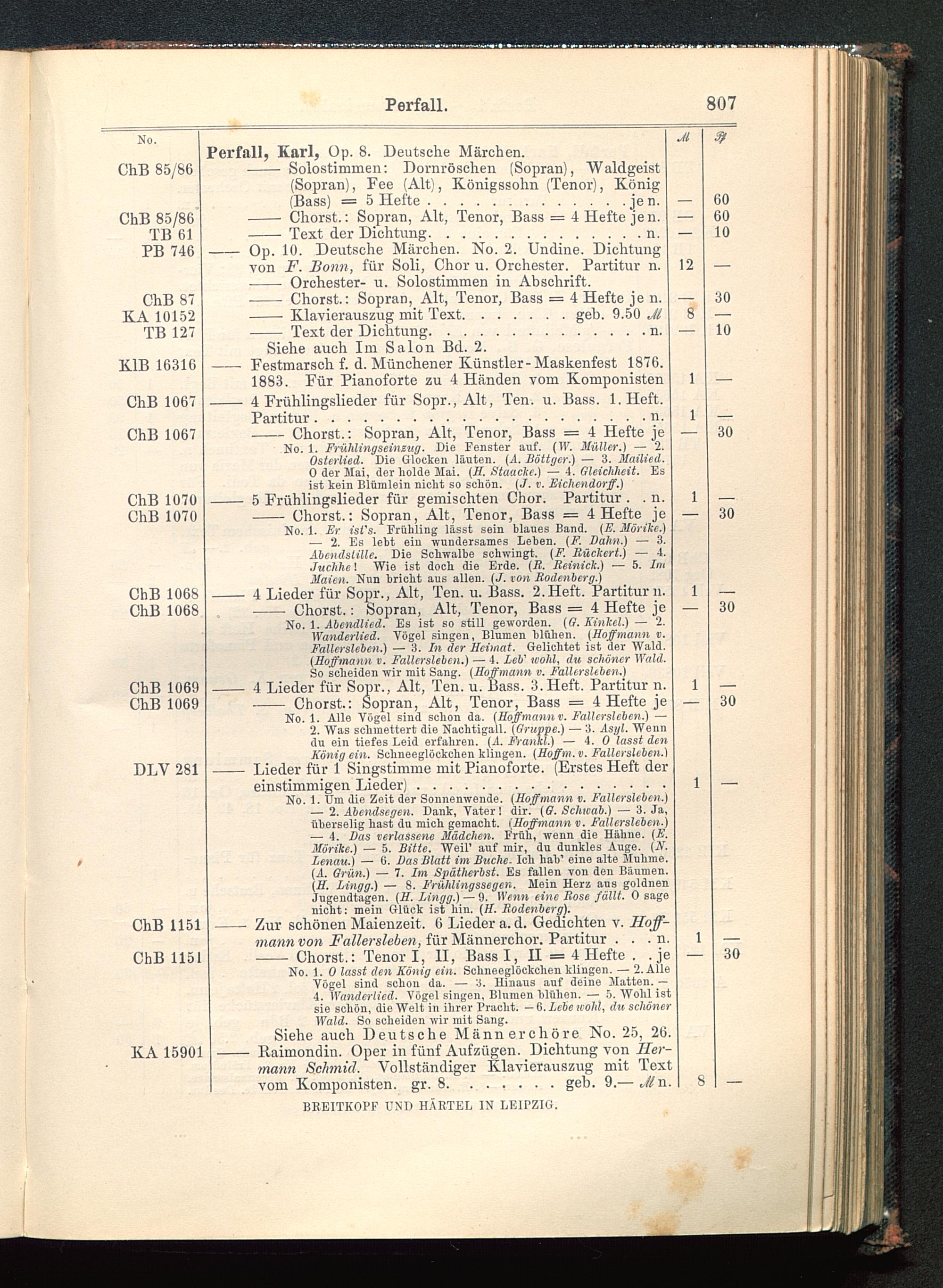 — Zur schönen Maienzeit. 6 Lieder a. d. Gedichten v. Hoff-mann von Fallersleben , für Männerchor. Partitur . . . n.- Chorst.: Tenor I, II, Bass I, H = 4 Hefte . .je