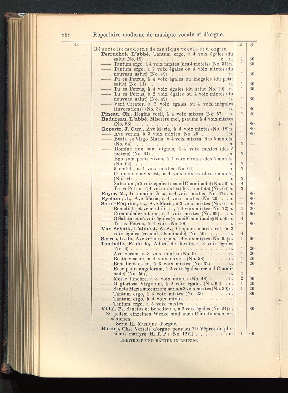 Vidal, P., Sanctus et Benedictus, ä 2 voix egales (No. 24) n.Zu jedem einzelnen Werke sind auch Chorstimmen er-schienen.Serie II. Musique d'orgue.Bordes, Ch., Versets d'orgue pour les 2 es Vepres de plu-