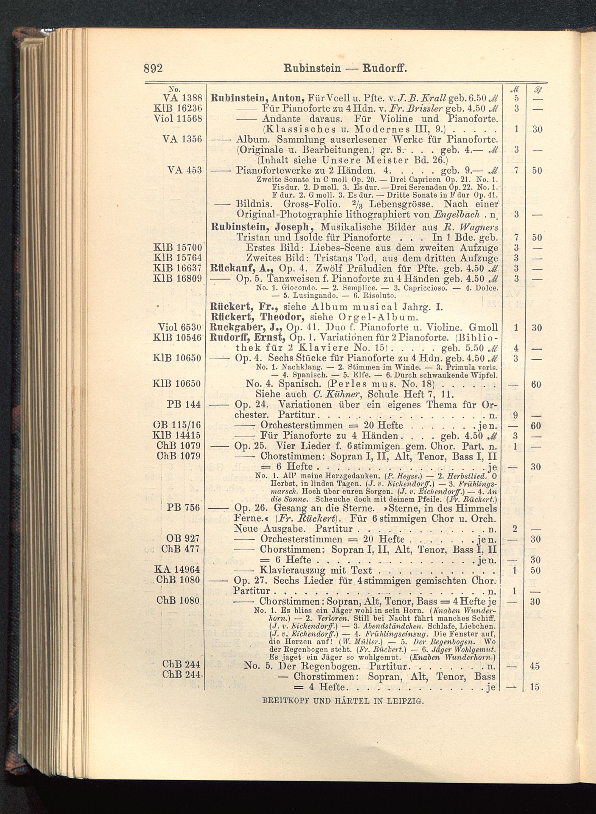 Rückert, Fr., siehe Album musical Jahrg. I.Rückert, Theodor, siehe Orgel-Album.Ruckgaber, J., Op. 41. Duo f. Pianoforte u. Violine. GmollRudorff, Emst, Op. 1. Variationen für 2 Pianoforte. (Biblio-thek für 2 Klaviere No. 15).....geb. 5.50 Jl