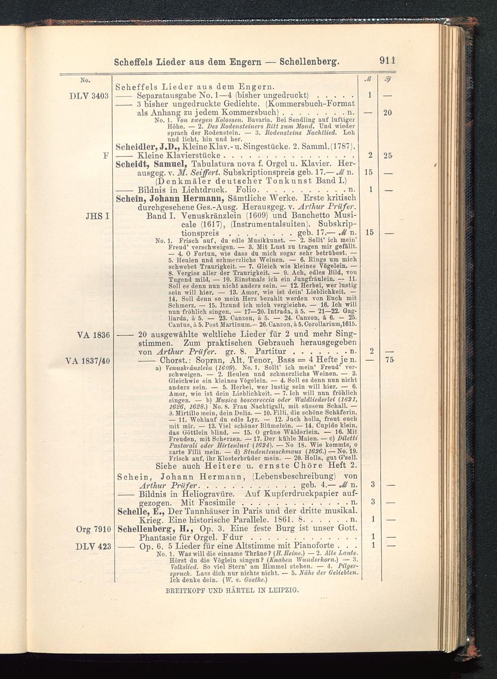 Schein, Johann Hermann , Sämtliche Werke. Erste kritischdurchgesehene Ges.-Ausg. Herausgeg. v. Arthur Prüfer .Band I. Venuskränzlein (1609) und Banchetto Musi-cale (1617), (Instrumentalsuiten). Subskrip-tionspreis ........geb. 17.— M n.