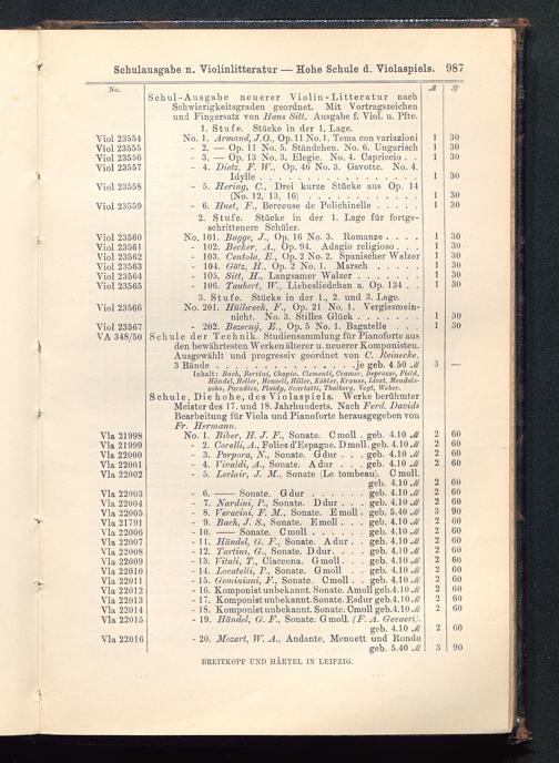 Schule, Die hohe, des Violaspiels. Werke berühmterMeister des 17. und 18. Jahrhunderts. Nach Ferd. DavidsBearbeitung für Viola und Pianoforte herausgegeben vonFr. Hermann.