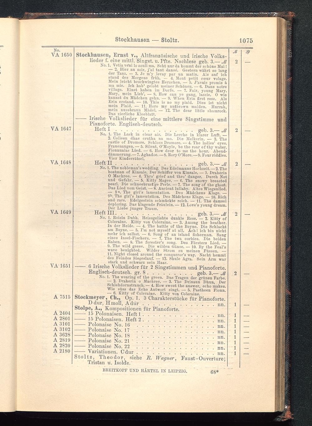 No. 1. Roisin Dobh. Heissgeliebte dunklo Rose. — 2. Kitty ofColoraine. Kitty von Coleraine. — 3. Among the heather.In der Hoide. — 4. Tho battle of tho Boyne. Die Schlachtam Boyne. — 5. Em not myself at all. Ach! ich bin nichtmehr ich selbst. — 0. Song of an island fisherman. Sangeinos Insel-Fischers. — 7. The twa corbies. Die beiden. Raben. —■ 8. The forester's song. Des Försters Lied. —9. The wild geese. Die wilden Gänse, — 10. By the Feal'swave benighted. Wilder Strom zu meinen Füssen. —11. Night closed around the conqueror's way. Nacht hemmtdes Feindes Siegeslauf. — 12. Shulo Agra. Sein Arm warstark und schwarz sein Haar.