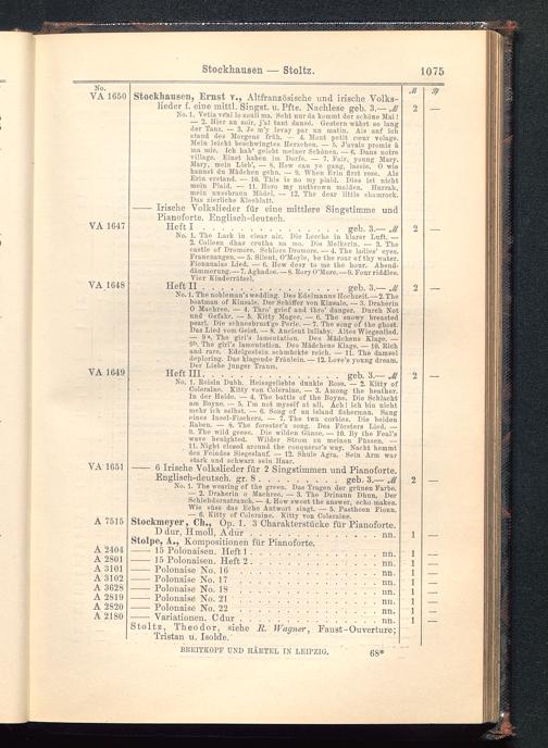 No. 1. The Lark in clear air. Dio Lerche in klarer Luft. —2. Colleen dhas crutha na mo. Die Melkerin. — 3. Thecastle of Dromore. Sehloss Dromore. — 4. The ladies' eyes.Frauenaugen.— 5. Silent, O'Moyle, bo the roar of thy water.Fionnualas Lied. — 0. How dear to ine tho hour. Abend-dämmerung.— 7. Aghadoe. — 8. Rory O'More.—9. Four riddles.Vier Kinderrätsel.