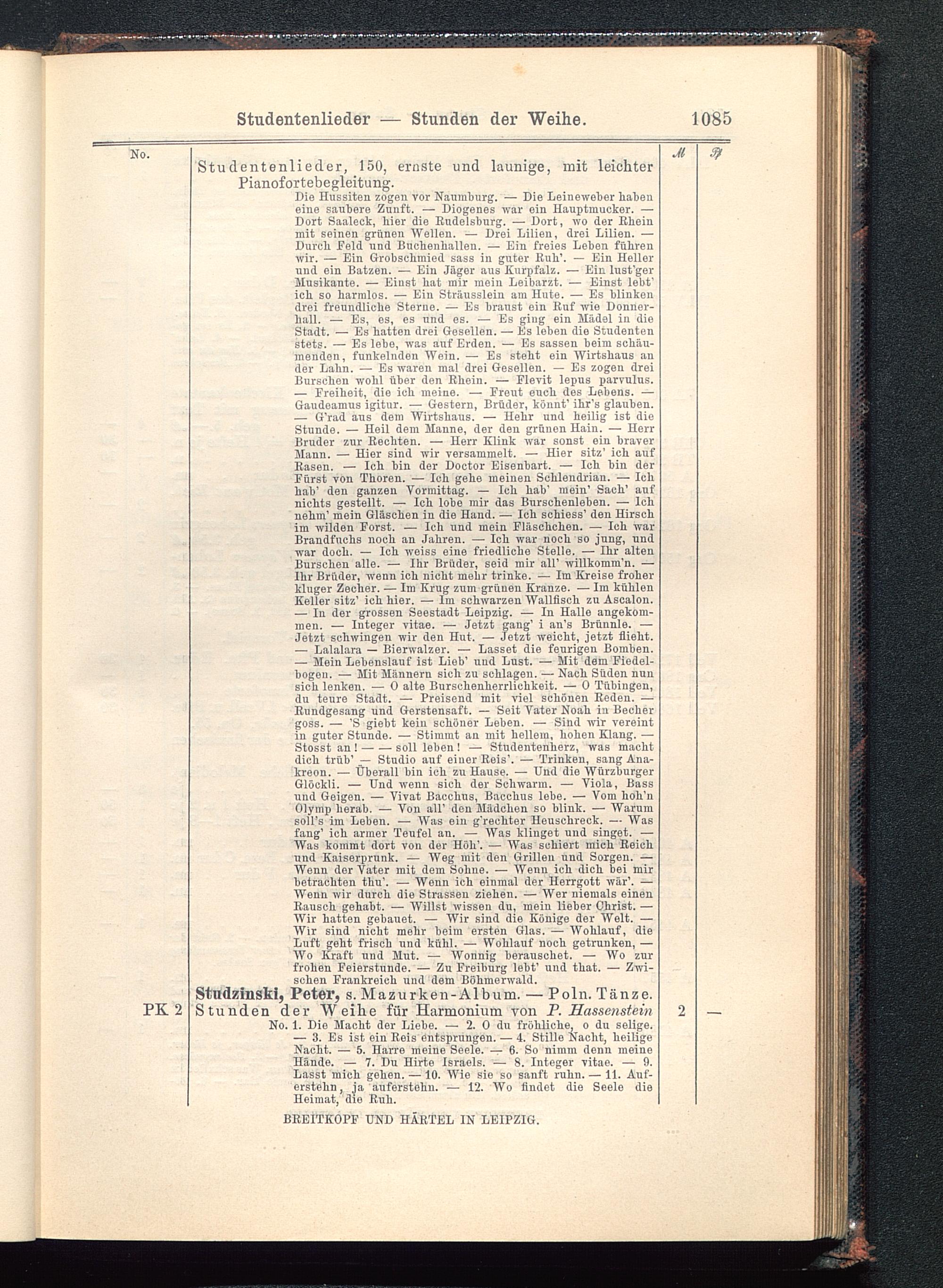— G'rad aus dem Wirtshaus. — Hehr und heilig ist dieStunde. — Heil dem Manne, der den grünen Hain. — HerrBruder zur Rechten. — Herr Klink war sonst ein braverMann. — Hier sind wir versammelt. — Hier sitz' ich aufRasen. — Ich bin der Doctor Eisenbart. — Ich bin derFürst von Thoren. — Ich gehe meinen Schlendrian. — Ichhab 1 den ganzen Vormittag. — Ich haV mein' Sach' aufnichts gestellt. — Ich lobe mir das Burschenleben. — Ichnehm' mein Gläschen in die Hand. — Ich schiess 1 den Hirschim wilden Forst. — Ich und mein Fläschchen. — Ich warBrandfuchs noch an Jahren. — Ich war noch so jung, undwar doch. — Ich weiss eine friedliche Stelle. — Ihr altenBurschen alle. — Ihr Brüder, seid mir all 1 willkomm'n. —Ihr Brüder, wenn ich nicht mehr trinke. — Im Kreise froherkluger Zecher. — Im Krug zum grünen Kranze. — Im kühlenKeller sitz 1 ich hier. — Im schwarzen Wallfisch zu Ascalon.