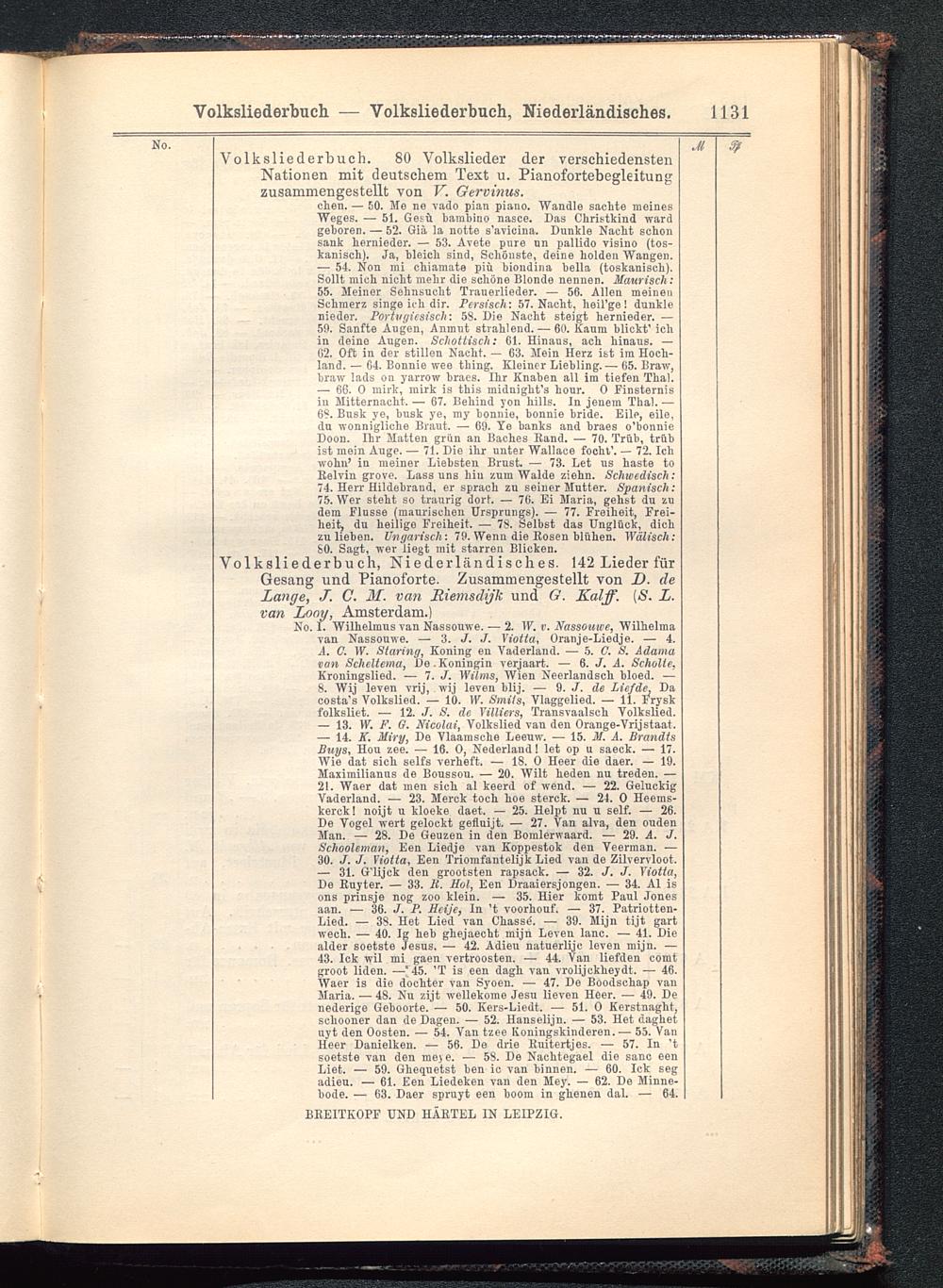 Volksliederbuch, Niederländisches. 142 Lieder fürGesang und Pianoforte. Zusammengestellt von D. deLange, J. C. M. van Riemsdijk und G. Kalff. {S. L,van Looy, Amsterdam.)