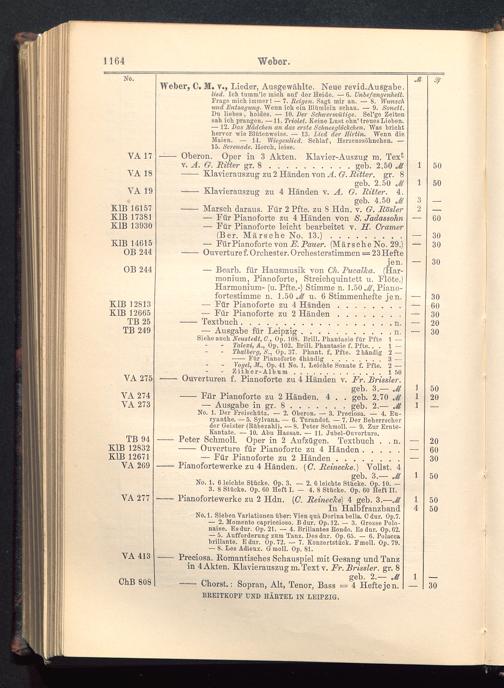 No. 1. Der Freischütz. — 2. Oberon. — 3. Preciosa. — 4. Eu-ryanthe. — 5. Sylvana. — 6. Turandot. — 7. Der Beherrscherder Geister (Rübezahl). — S, Peter Schmoll. — 9. Zur Ernte-Kantate. — 10. Abu Hassan. — 11. Jubel-Ouverturo.