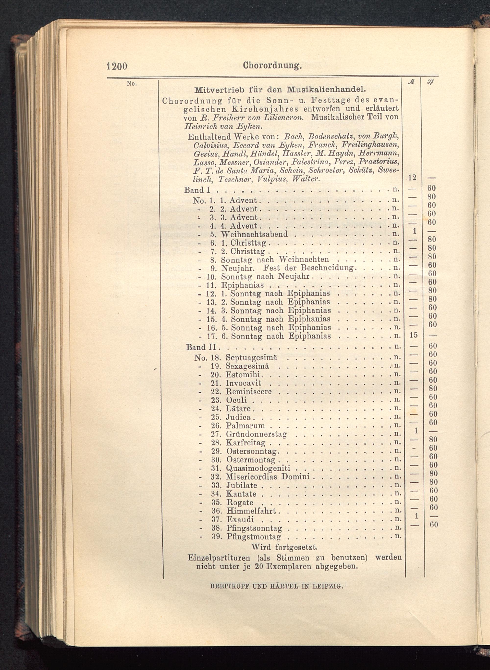 Enthaltend Werke von: Bach, Bndenschatz, von Burgk,Calvisius, Fccard van Eyken, Franck, Freilinghausen,Gesius, Handl, Händel, Hassler, M. Haydn, Herrmann,Lasso, Messner, Oslander, Falestrina, Perez, Praetorius,F. T. de Santa Maria, Schein, Sehroeter, Schütz, Swee-linck, Teschner, Vulpius, Walter.