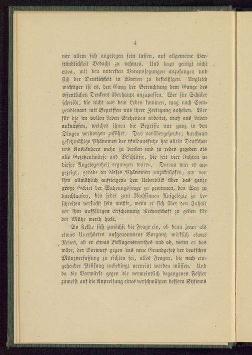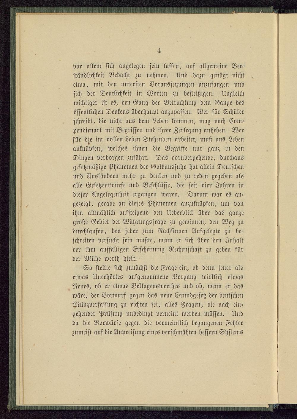 vor allem sich angelegen sein lassen, ans allgemeine Ver-ständlichkeit Bedacht zu nehmen. Und dazu genügt nichtetwa, mit den untersten Voraussetzungen anzufangen undsich der Deutlichkeit in Worten zn befleißigen. Ungleichwichtiger ist es, den Gang der Bctrachtuug dem Gange desöffentlichen Denkens überhaupt auzupasscu. Wer für Schülerschreibt, die nicht aus dem Leben kommen, mag nach Com-pcndienart mit Begriffen und ihrer Zerlegung anheben. Werfür die im vollen Leben Stehenden arbeitet, muß aus Lebenanknüpfen, welches ihnen die Begriffe nur gauz in denDingen verborgen zuführt. Das vorübergehende, durchausgesetzmäßige Phänomen der Goldausfuhr hat allein Deutschenund Ausländern mehr zu denken und zu reden gegeben alsalle Gesetzentwürfe und Beschlüsse, die seit vier Jahren indieser Angelegenheit ergangen waren. Darnm war es an-gezeigt, gerade an dieses Phänomen anzuknüpfen, um vonihm allmählich aufsteigend den Uebcrblick über das ganzegroße Gebiet der Währnngsfrage zn gewinnen, den Weg zudurchlaufen, den jeder zum Nachsinnen Aufgelegte zu be-schreitcn versucht sein mußte, weuu er sich über den Inhaltder ihm auffälligen Erschciuuug Rechenschaft zu geben fürder Mühe werth hielt.